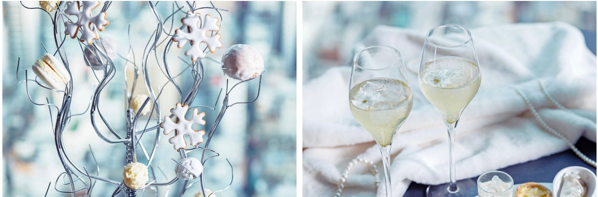 開業以来、好評をいただいているツリー型スタンドには、雪の結晶を模ったバニラクッキーや、オレンジの薫るクリームチーズを忍ばせた白いマカロン、スノーボールやエルダーフラワーのギモーヴなど、一口サイズの可愛らしいスイーツ7種類が白い木の実のように並びます。またウェルカムドリンクとして、玄米茶とマヌカハニーにバラのシロップを合わせた、芳醇な香りとさっぱりとした後味が魅力のノンアルコールカクテルをご提供いたします。 大阪市街がパノラマに広がる絶景ラウンジで、見た目にも美しい真っ白なアフタヌーンティーを楽しむ特別な冬のひと時をお過ごしください。