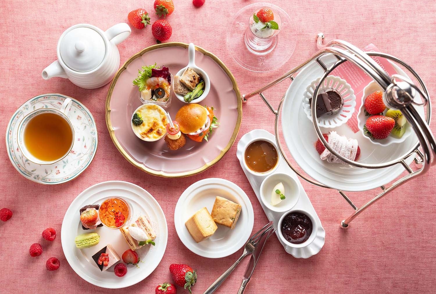 プチガトー〔あまおうミルフィーユ、あまおうオペラ、あまおうタルト、スパークリングワインとペッパーのジュレ、あまおうモンブラン、あまおうアイス、ディアマンショコラ、マカロン(ピスターシュ)、チョコレート(コロンビー)/ スコーン2種(いちご、プレーン)/ 季節のフルーツ、いちご、フランボワーズ / ポークのロースト オニオンソース / スモークサーモンバーガー / シーフードとオリーブのマリネ 生姜のフレーバー / ごろごろ野菜とトマトのドリア / ひとくちコロッケとモッツァレラチーズのピンチョス / コーヒーまたは紅茶