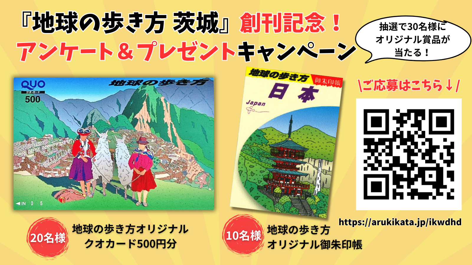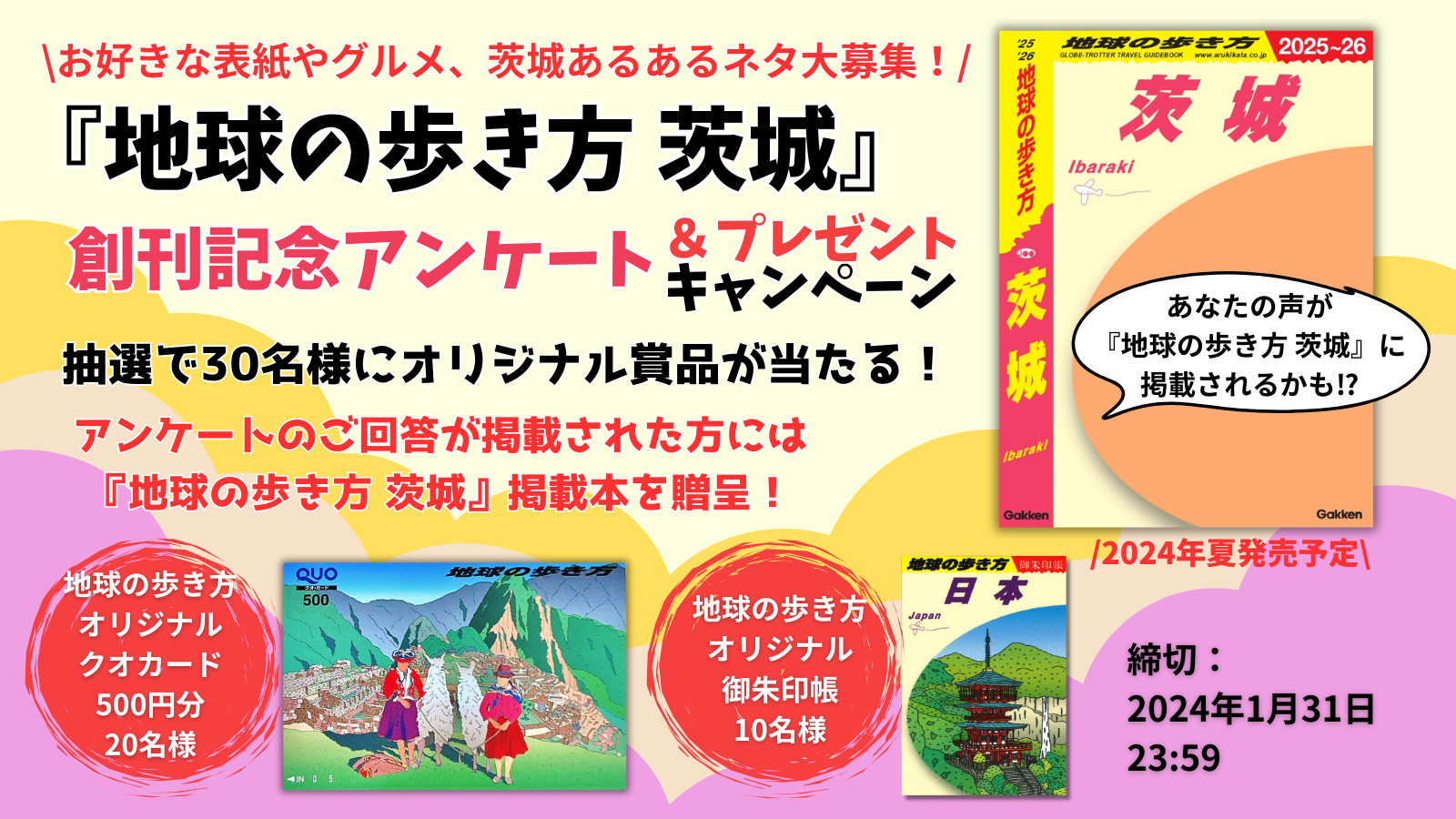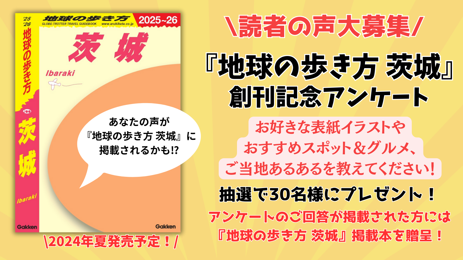『地球の歩き方 茨城』の制作決定を記念し、2023年12月18日よりアンケート&プレゼントキャンぺーンがスタートします。『地球の歩き方 茨城』の表紙を飾るイラストやおすすめスポット&グルメ、ご当地あるあるネタなどについて、茨城県民をはじめ、茨城が最近気になる読者の生の声を大募集。お寄せいただいた貴重なご意見や体験談が『地球の歩き方 茨城』に掲載された場合、掲載本を贈呈。また、アンケートにお答えいただいた方の中から抽選で30名様に、「地球の歩き方オリジナルクオカード」などのプレゼントが当たります。(締切:2024年1月31日)