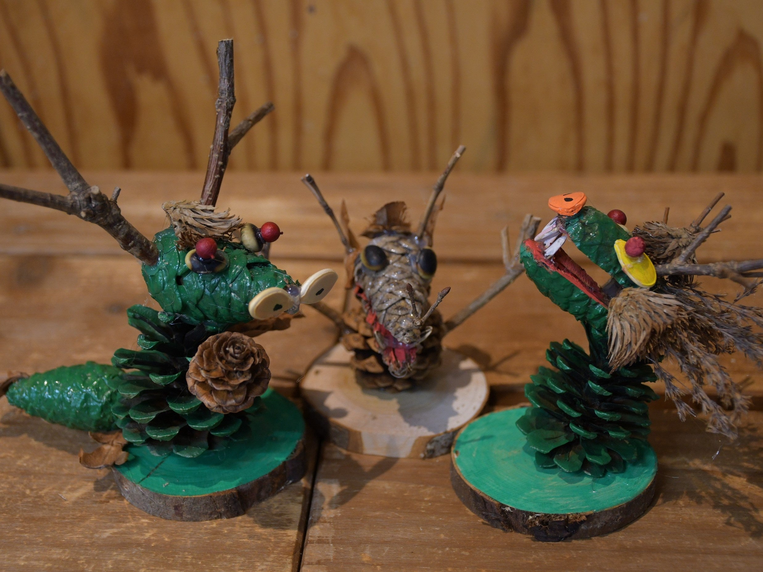 「山仕事・創作グループ」の創作体験はメニューを変えながら毎日開催しています。年末年始には2024年の干支「辰」をモチーフにしたクラフトを開催します。