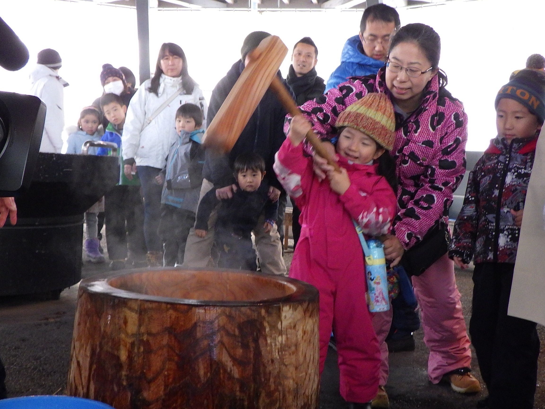 「山の恵み・食グループ」による新春の特別イベントとして、杵と臼を使った餅つき体験を開催します。ついたお餅は、きな粉や小豆・ゴマをトッピングして振舞います。