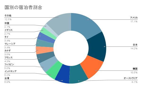 私たちの施設に宿泊されたお客様を対象に国別(※)の割合を集計しました。