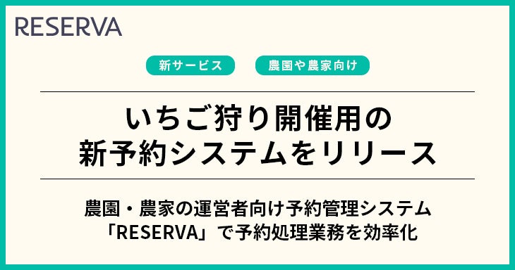 RESERVA(https://reserva.be)は、観光業やレクリエーション施設など350業種以上に対応した業界最大級の予約システム。年間5,000件を超えるイベント・行事のほか、近年は農園・農家での導入が進み、ぶどう狩りやさくらんぼ狩りをはじめとした収穫体験の予約受付でも活用されている。2023年後半に入り、農園から効率の良いイベント運営を実現したいとの要望が増加したことを受け、いちご狩り専用の予約システムをリリースすることが決定した。