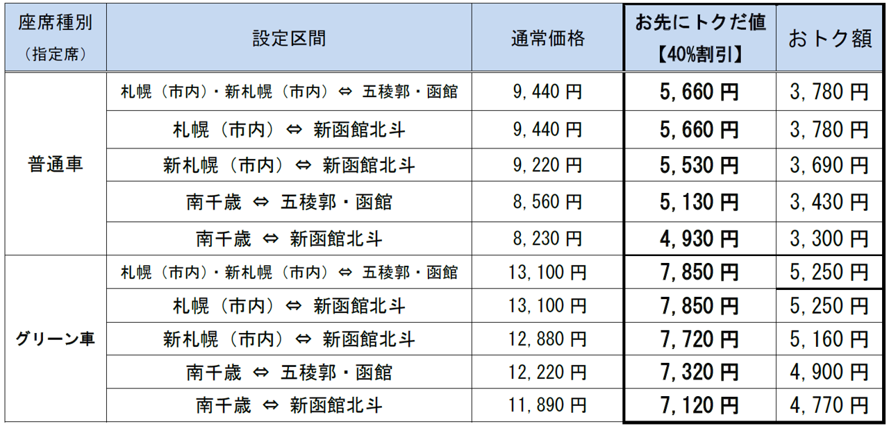 〇JR北海道とJR東日本は、北海道と北東北エリアの相互流動をさらに活性化させるために、東北・北海道新幹線「はやぶさ」「はやて」が50%割引となる「お先にトクだ値スペシャル(乗車券つき)」とJR北海道在来線特急列車「北斗」が40%割引となる「お先にトクだ値(乗車券つき)」を発売します。 〇今回はグリーン車用も設定します。ぜひこの機会にゆったり広々とした座席、ゆとりと落ち着きのある空間で、上質&おトクな旅をお楽しみください。 |