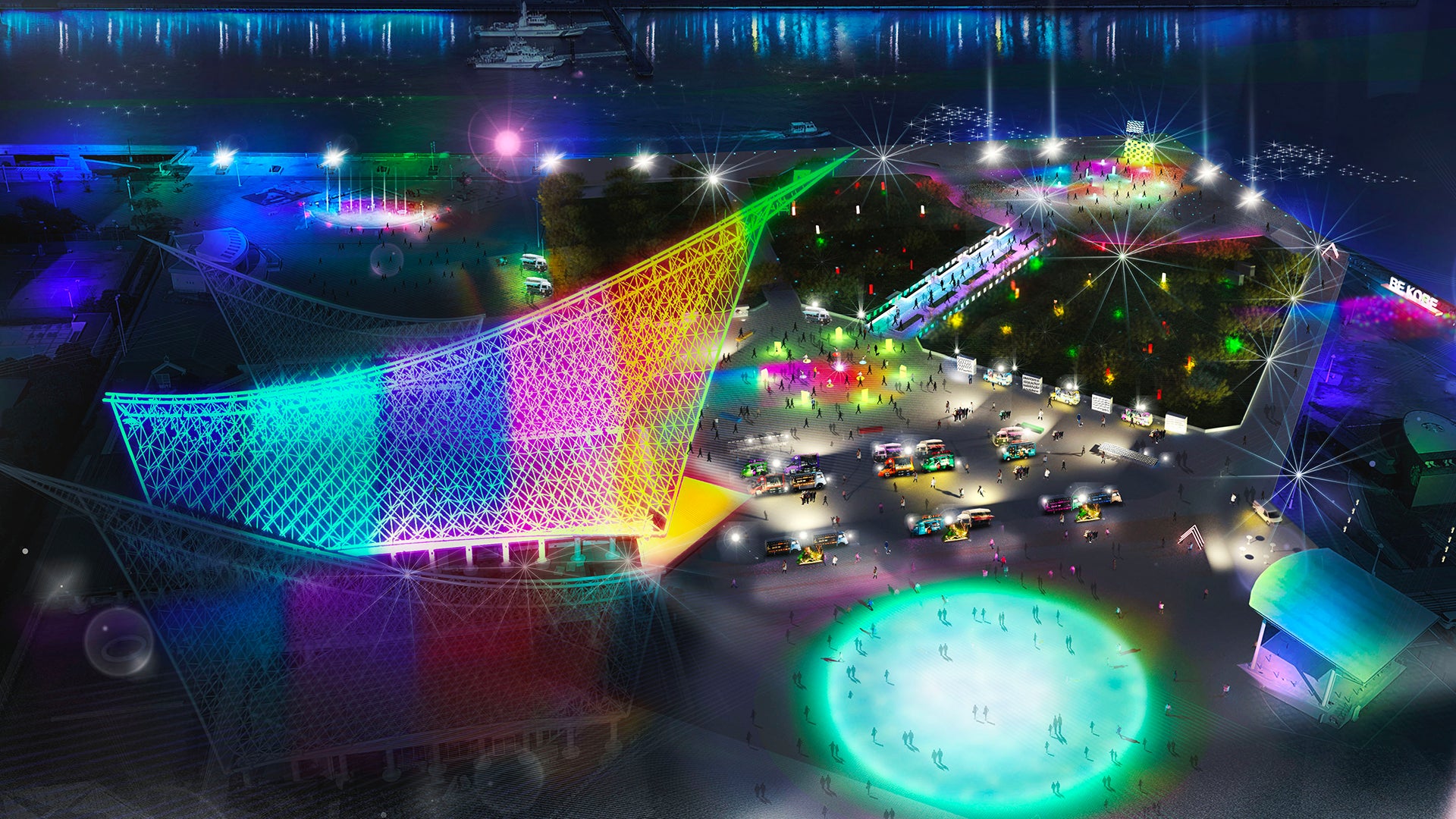 「市民が神戸市民であることを誇りに思う気持ち」を表した「BE KOBE」のあるメリケンパークを陸に近い生命の連なりを感じる「海の浅瀬あたり」の世界を光と音と映像でイメージします。