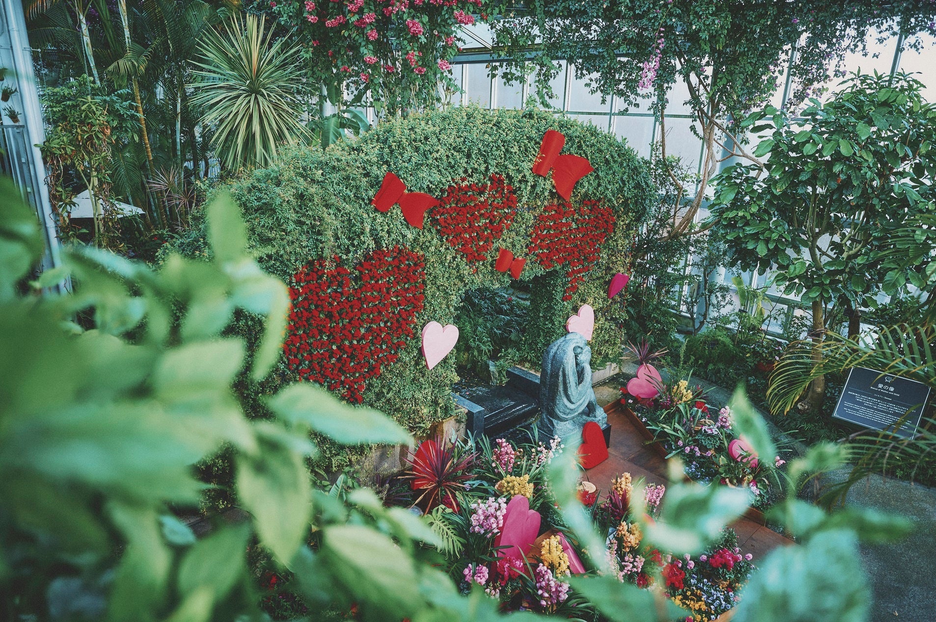 バレンタイン発祥の地、イタリアのテルニ市より、1992年に日本のバレンタイン発祥の地、神戸市へ寄贈されました。熱帯の花々や果実、スパイスなどが彩るグラスハウス(温室)内にある「愛の像」の前は、1年を通して人気の撮影スポットです。期間中は、「愛の像」前に特設の花壇が登場。壁面には約300株のカランコエ レッド。特設花壇は、約20種300株の暖色系の草花やハート型のオブジェ、リボンであたたかな雰囲気を演出しています