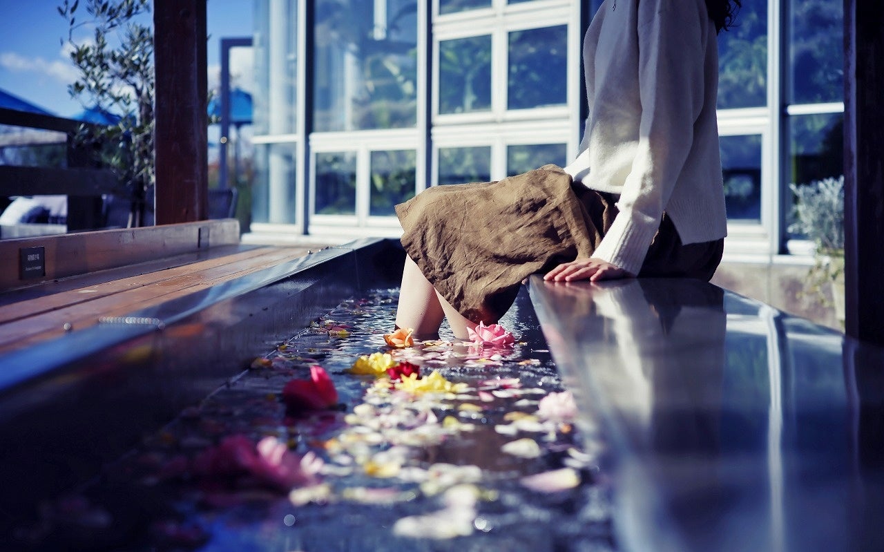 温室を通り抜けると、季節のハーブ(カモミールブレンド)が浮かぶ足湯。神戸の景色を眺めながら、心からだもぽかぽかに