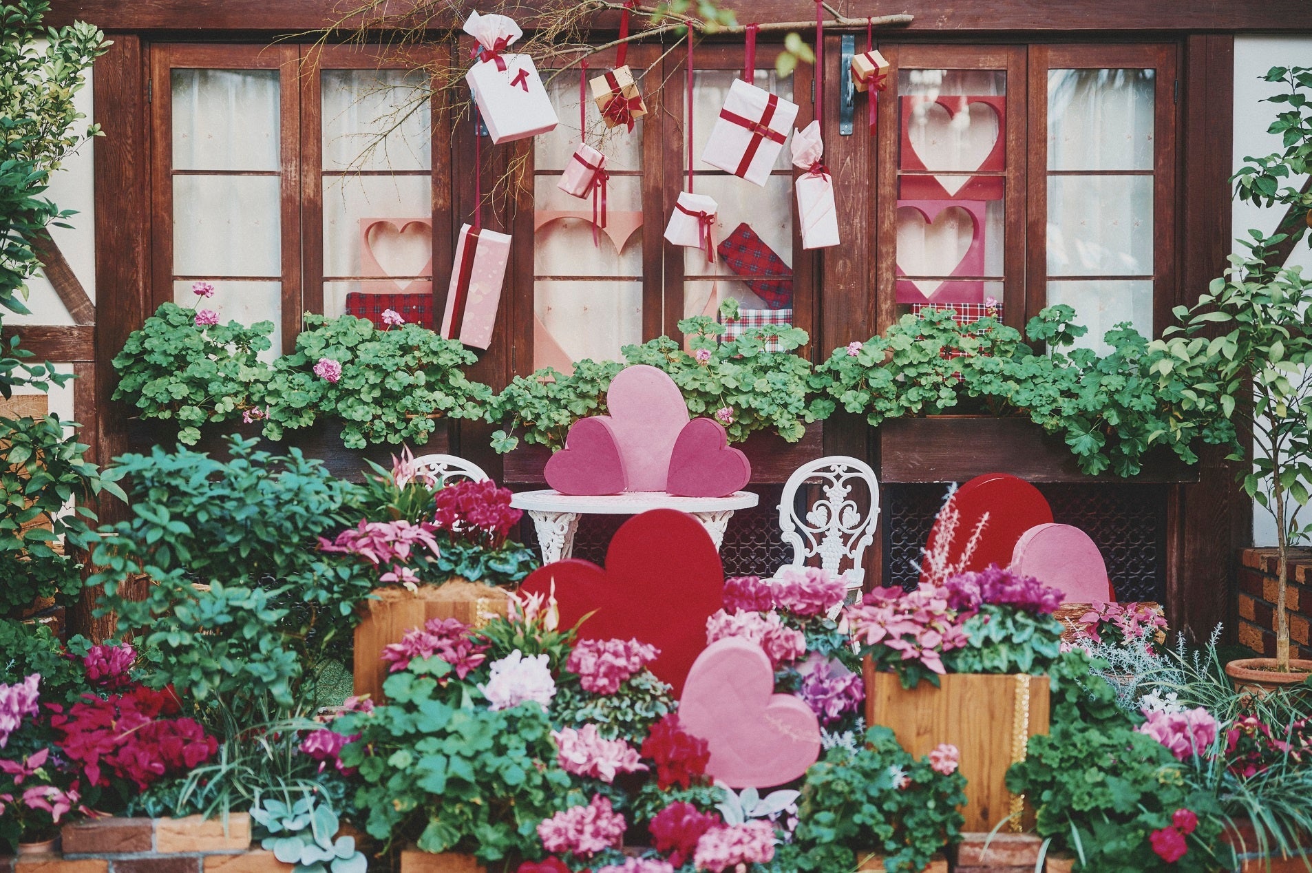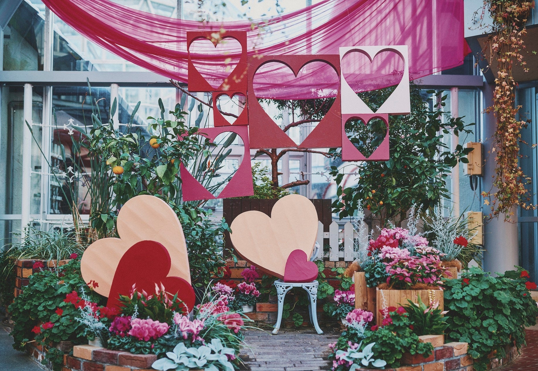 通年を通してフォトスポットとして人気のグラスハウスのエントランスが、赤やピンク、ハート型のオブジェで彩られます。天井から降り注ぐあたたかな光と花のハンギングバスケット(トラディスカンティア、ストレプトカーパス)とともに心温まる