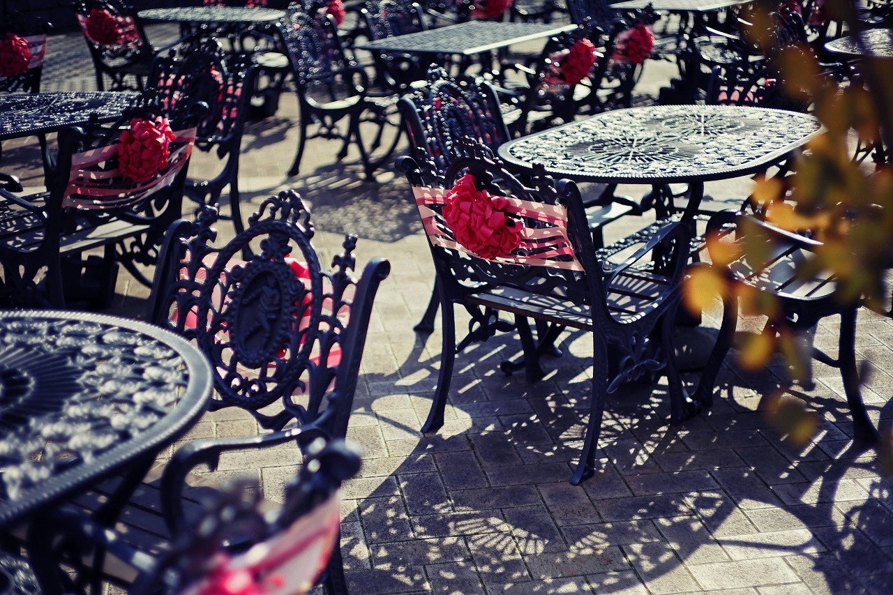 ドイツの古城ヴァルトブルク城をモチーフにした展望レストハウスや城門に囲われる憩いの広場。ピンク、赤色のリボンを纏ったチェアがずらりと並ぶ可憐な空間に