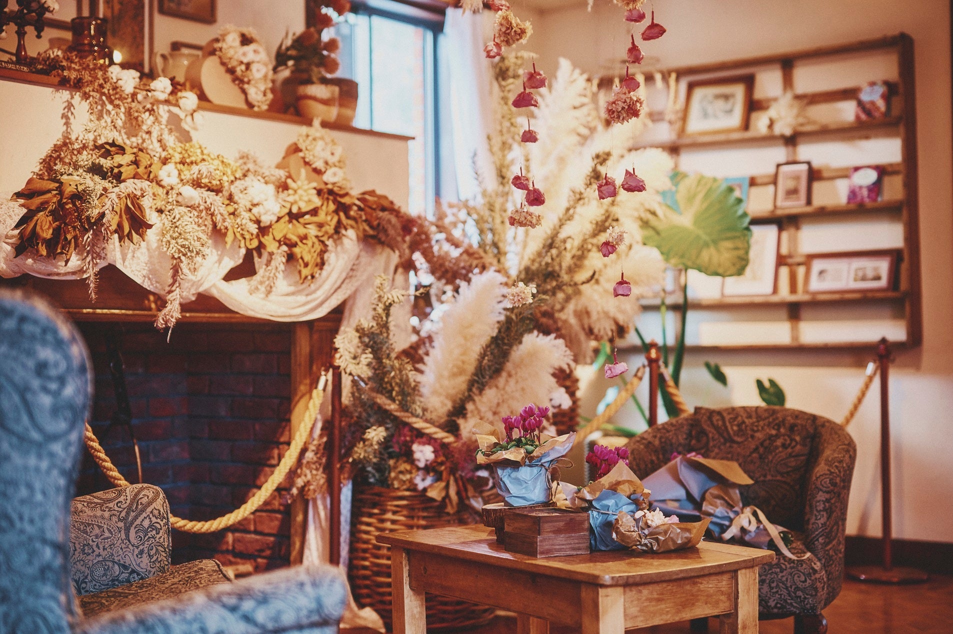 ドライフラワーでハーブのある暮らしをおしゃれに演出する人気の展示スペース。キッチン、ダイニング、リビング、バスルームなどフォトスポットとして人気のハーブの家もバレンタインをイメージしたディスプレイで演出。あたたかで上質な暮らしの空間です
