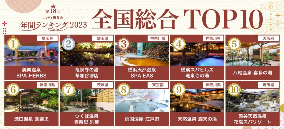 新型コロナウイルスが5類に移行されてから初の年間ランキングとなった今回は、過去最高の20万を超えるユーザー投票が集まり、温浴レジャーへの関心の高さがうかがえました。