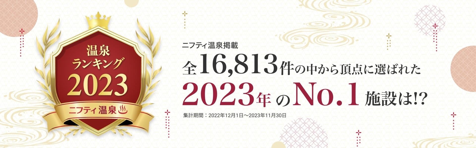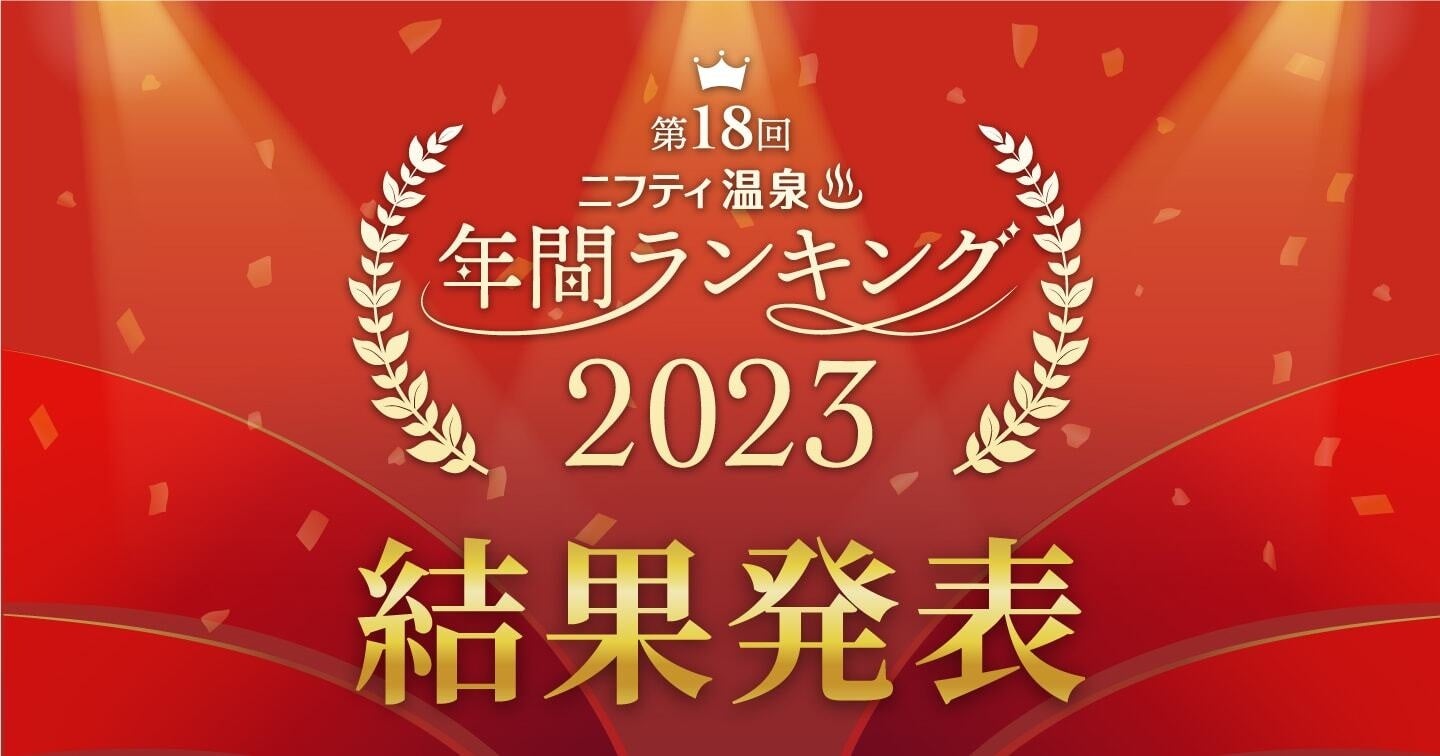 「ニフティ温泉 年間ランキング」は、「ニフティ温泉」に掲載された全国16,813件(2023年11月30日現在)の温泉・温浴施設を、施設紹介ページの閲覧件数や口コミ評価、クーポンの利用状況、ユーザー投票などの独自の視点からランキング形式で発表するものです。