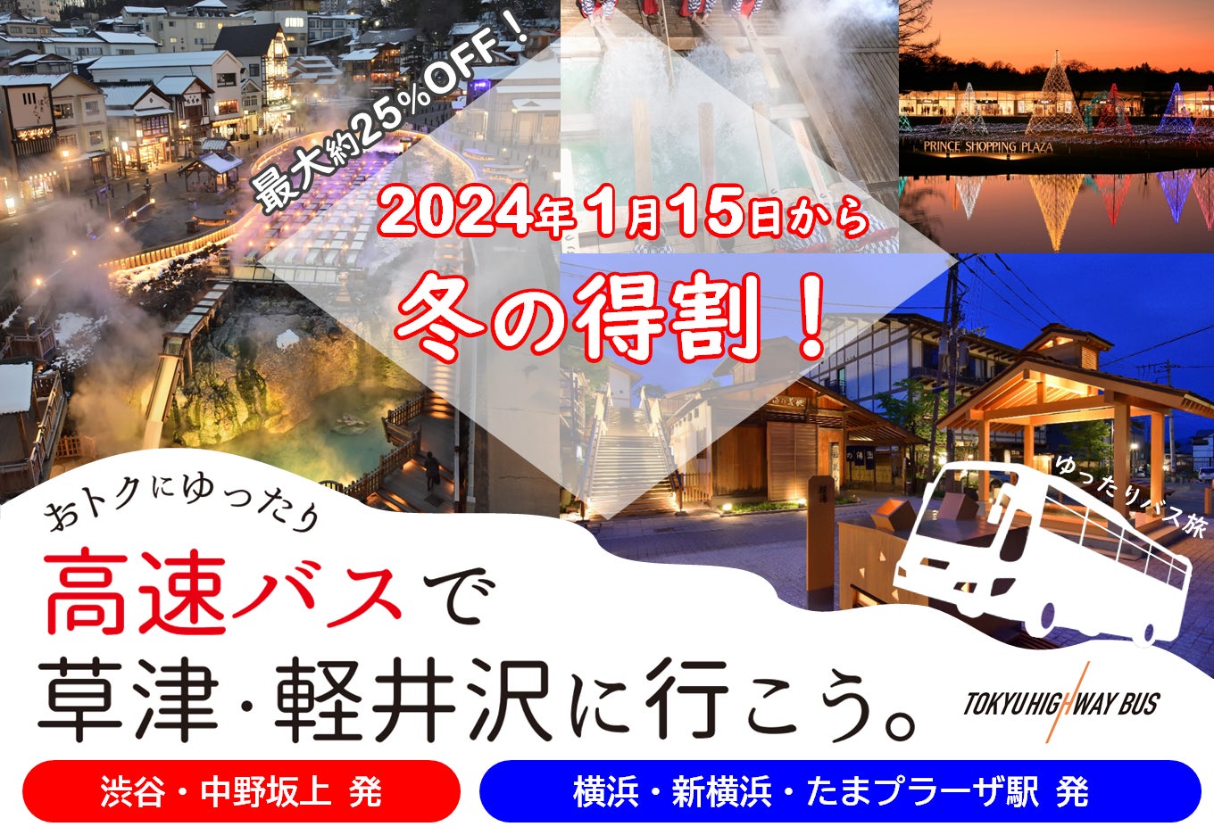 東急ハイウェイバスでは、2024年1月15日から「渋谷マークシティ・中野坂上駅~軽井沢・草津温泉」および「横浜駅西口・新横浜駅・たまプラーザ駅~軽井沢・草津温泉」の高速バスでお得な運賃割引キャンペーンを冬の期間限定で実施いたします。