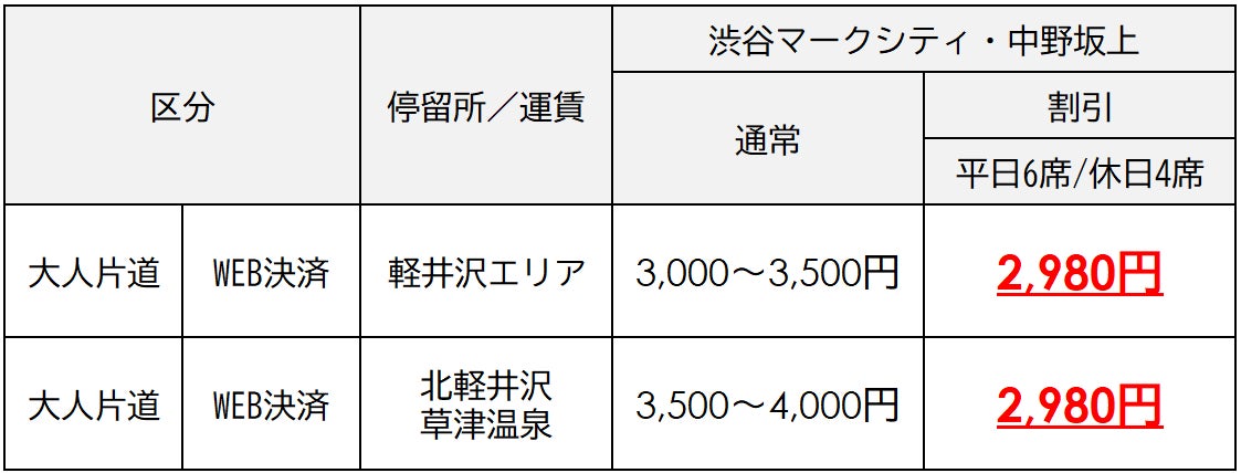 ①・②の割引どちらも、軽井沢駅まで3,000円、草津温泉まで3,500円でご乗車になれます!