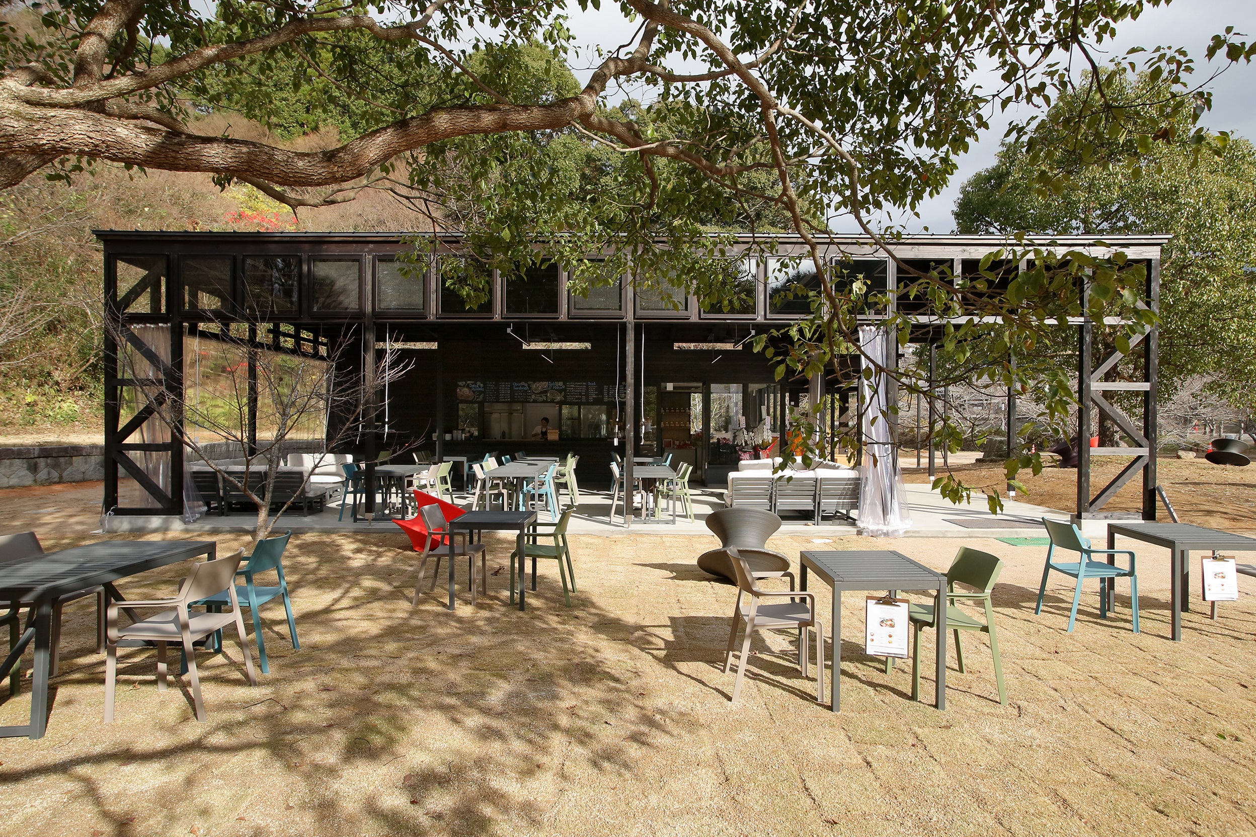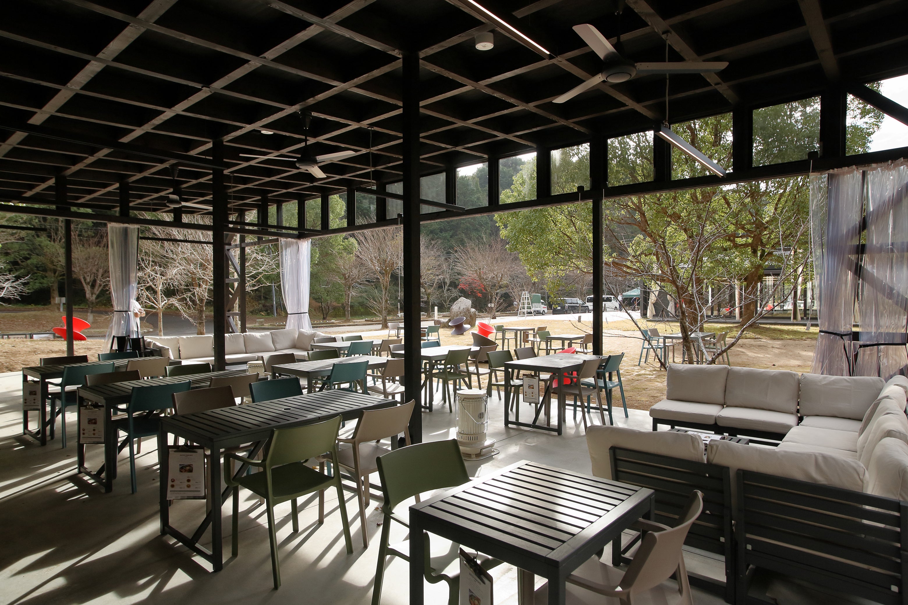 半屋外のスペースに約40席をご用意。OND PARKの自然に囲まれた環境で四季折々の景観を楽しみながら食べる食事はより一層美味しく、気分をリフレッシュしてくれます。
