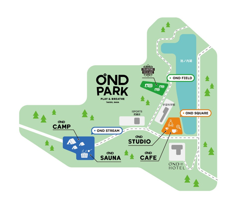 不動産事業などを⼿掛ける朝⽇I&Rホールディングス株式会社(本社:佐賀県武雄市 代表取締役:野畑⿓彦)が、癒し・交流・運動をテーマとした開発コンセプト「Tuning Park」を掲げ、約100haの広⼤な「武雄温泉保養村」の豊かな⾃然を活かした施設整備をおこないます。OND PARKは保養村内の3つのエリアを整備し、様々な体験ができる施設を順次オープン予定。現在エリアには、「OND STUDIO」と「OND CAFE」がオープンし、来年春にはキャンプサイト・サウナが楽しめる施設が誕生します。