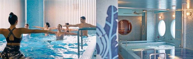 水色の世界が広がるスパ8 WATER CAVEのリラクゼーションプールで行う水中ヨガは、心地よい浮遊感と穏やかな動きが調和し、宿泊者のご滞在をより特別なものにします。