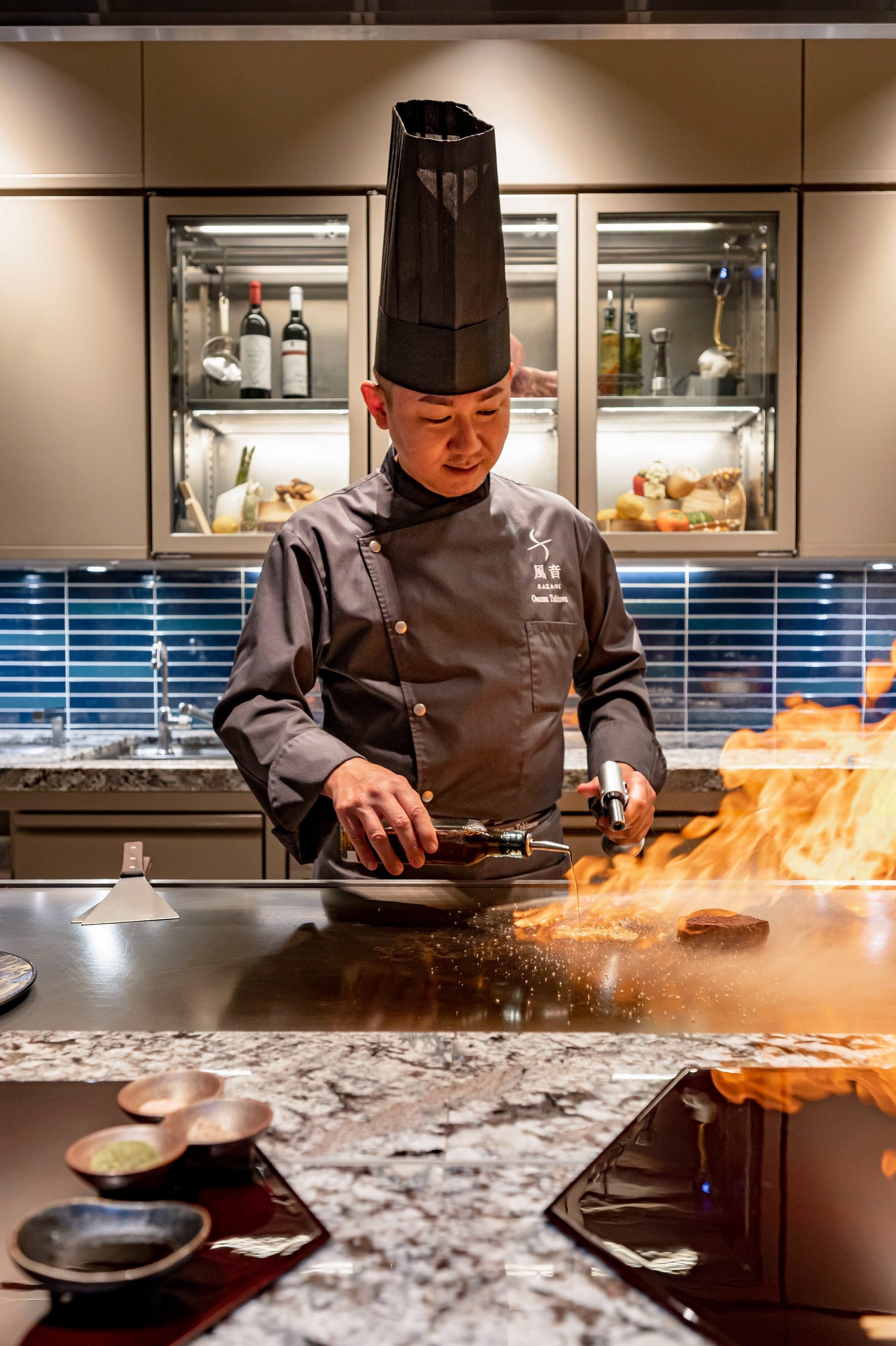 職人の技を目の前で堪能しながら、選び抜いた銘柄牛と山の幸、海の幸を楽しめる鉄板焼「風音(かざね)」。アトリウムの中央、カフェ&バー「リュトモス」とイタリアングリル「メロディア」の奥に位置し、リズム、メロディ、ハーモニーの3つの要素が融合した美しい音楽に、鉄板の上で食材を焼く音や立ちのぼる香りが風格を加えます。歌舞伎の下座音楽にもある「風音(かざおと)」をヒントに、音色のバリエーションや変化を、歌舞伎や雅楽の伝統的な舞台構成である「序破急」と捉え、3 種類の鉄板焼のコース料理をご用意しています。カウンター越しにシェフとの会話を楽しむ贅沢な空間です。