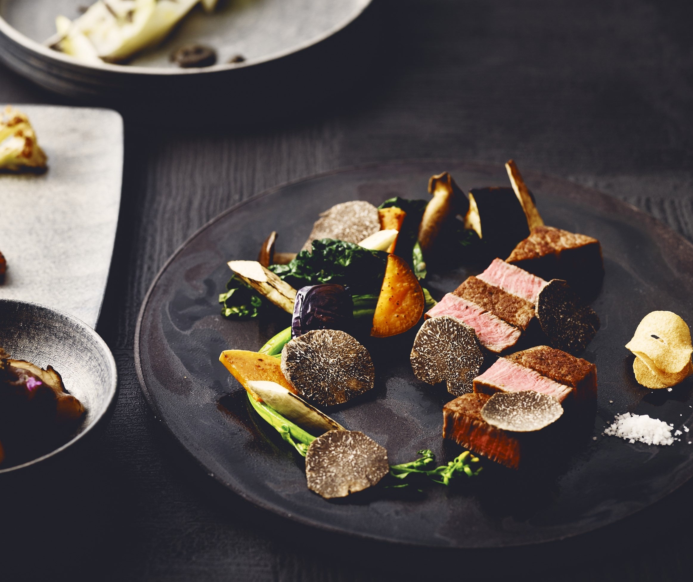 前菜の厳選黒毛和牛の鉄板すき焼きは、黒トリュフの香りを最大限ご堪能いただけるよう、提供の直前に削り雪仕立てでふんわりと添えます。メインの厳選黒毛和牛にもフレッシュな黒トリュフをたっぷりとスライスし、そのままの香りを存分にお楽しみいただけるよう仕上げました。