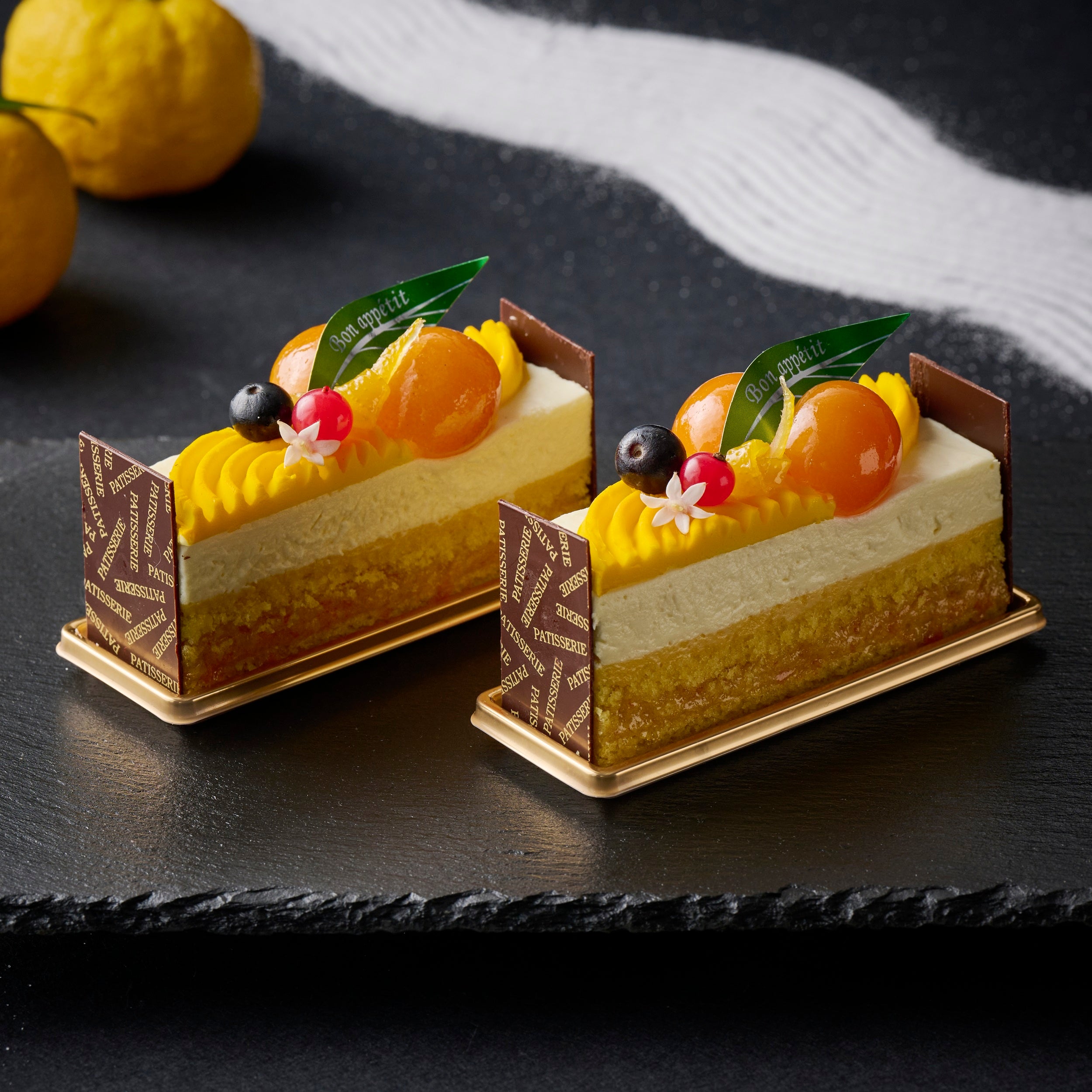 爽やかな柚子とコクのあるレアチーズの調和を楽しめるスイーツです。金柑のコンポートや柚子皮、ブルーベリー、赤すぐりなどで鮮やかに彩り、新年のお祝いにふさわしい華やかなスイーツに仕上げました。