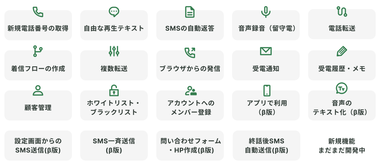 サービスの機能として、電話応答の分岐を自由に設定でき、AI自動応答やSMS返信・電話転送・アプリ転送・顧客管理(CRM)など、フロントオフィスの業務を支える機能を幅広く利用可能です。