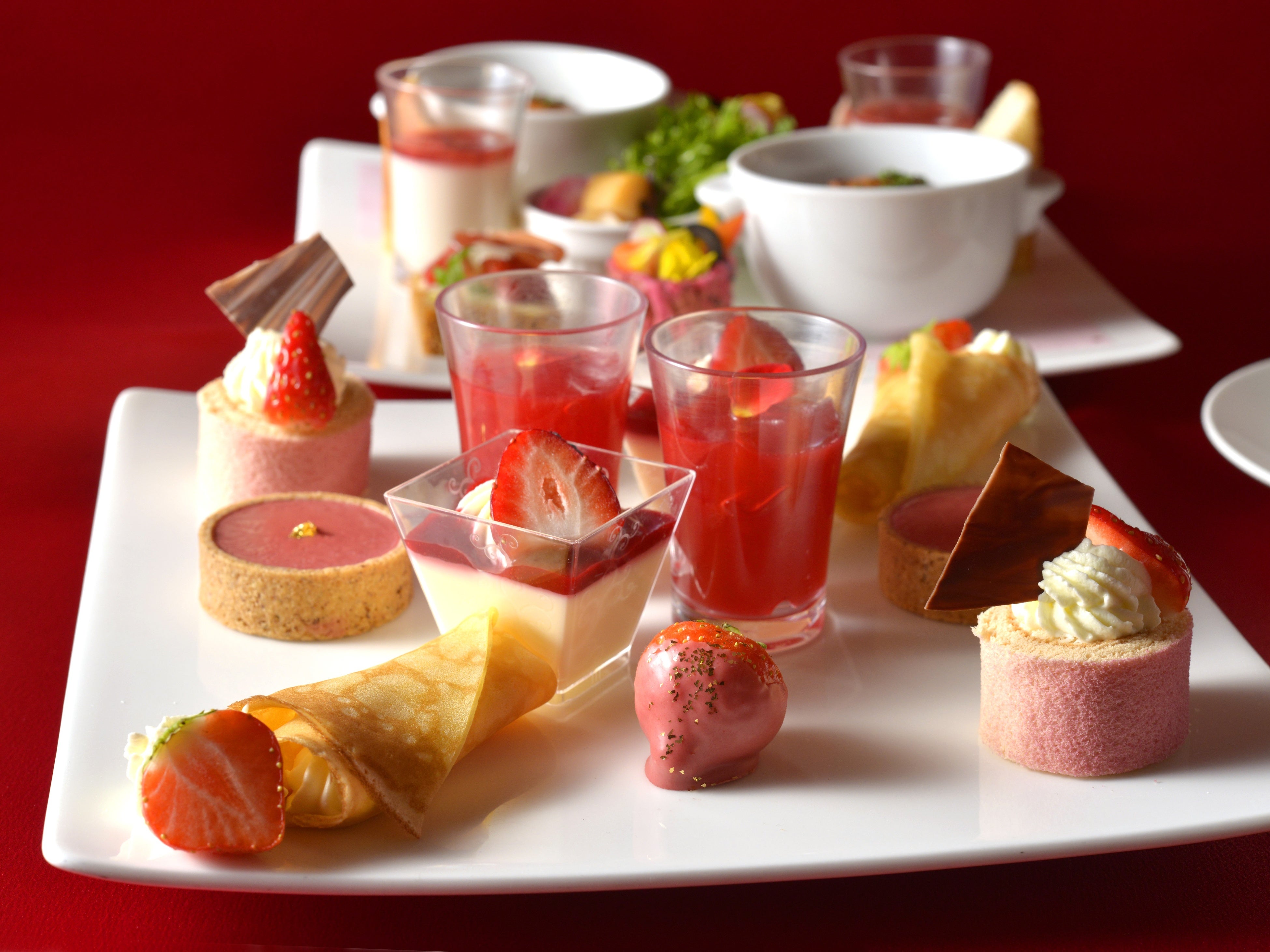 ご好評のアフタヌーンティーがストロベリーバージョンで登場。ロールケーキやクレープ、パンナコッタ、チョコレートタルトなど、赤とピンクの配色が美しいイチゴを用いたスイーツが並びます。また、ストロベリーと生ハムのパンデピスをはじめ一部のセイボリーにもイチゴを取り入れ、スイーツとの相性にこだわりました。