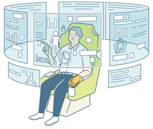 万博会場外では、お客様一人一人の日常の健康チェックデータに合わせて、駅ナカを活用した「駅(エキ)ササイズプログラム」や「ヘルシーレストラン」をリコメンドするなど、日常生活の延長で、負荷なく健康管理ができるとともに、駅に訪れたくなるような新しい価値をご提供することを検討中。