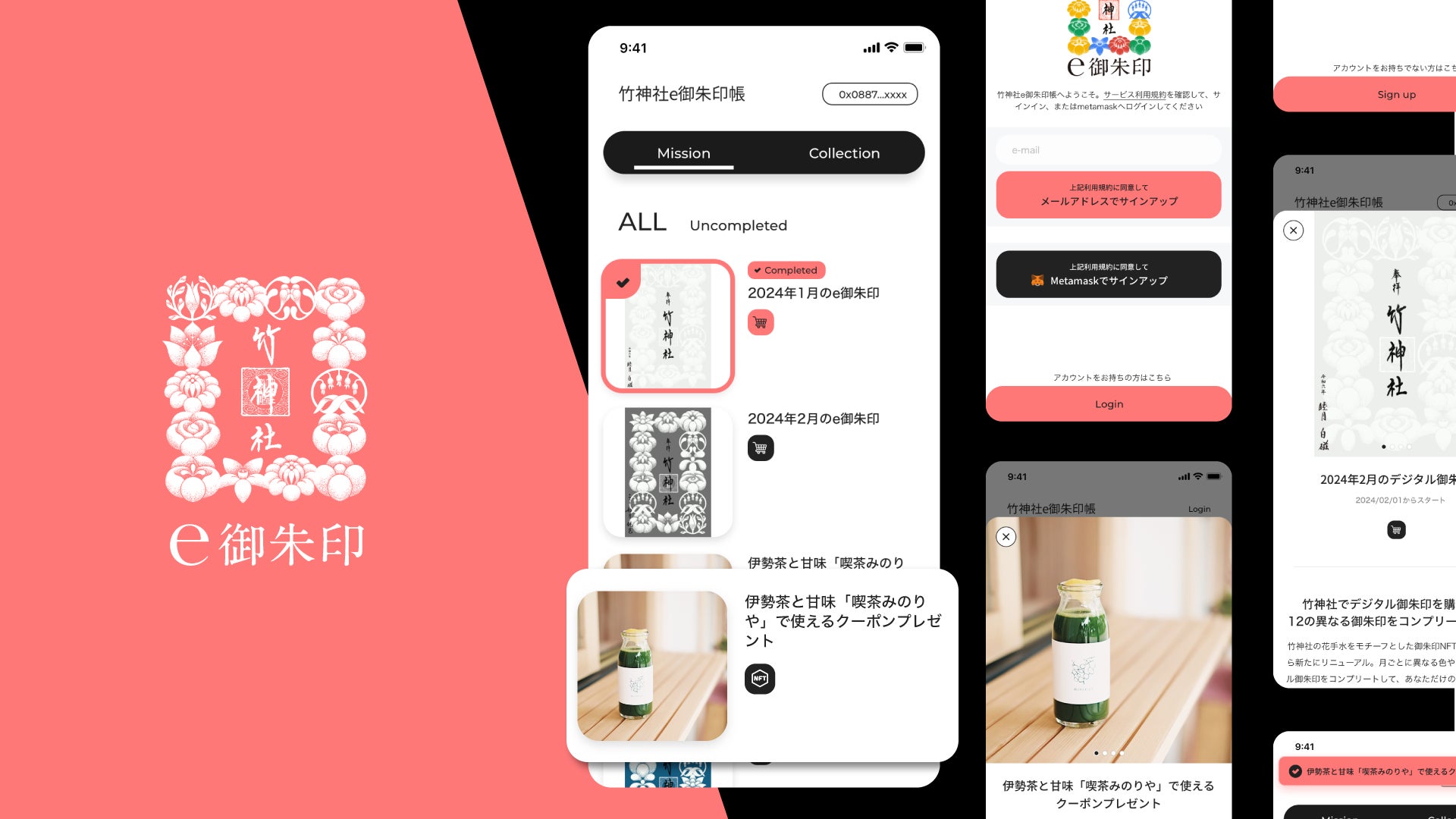 法人向けにweb3ソリューションを展開する株式会社クリプトリエ(代表取締役 CEO:手塚 康夫、本社:東京都中央区、以下クリプトリエ)は、御朱印をデザインしたNFTをコレクションして、クーポンも獲得出来る「e御朱印」の開発を行いました。明和町竹神社にて2024年1月より頒布を開始します。竹神社の御朱印NFTデザインは株式会社博報堂、株式会社博報堂キースリー(東京都港区、代表取締役社長:重松俊範)、明和町の店舗で使えるクーポン設計は、明和町の観光地域づくりを推進する一般社団法人明和観光商社(三重県明和町、代表理事:千田良仁)が行いました。