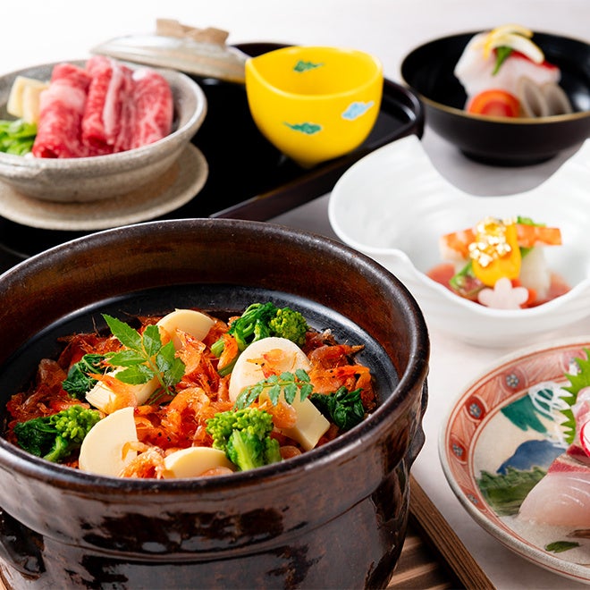 香ばしく濃厚なロゼ色に揚げられた桜海老はサクサクの食感と香りが特長。香りと旨みを閉じ込めた土鍋仕上げの炊き込みご飯や黒毛和牛の旨みと春の山菜を楽しめる春菜鍋などが味わえる季節の会席料理です。