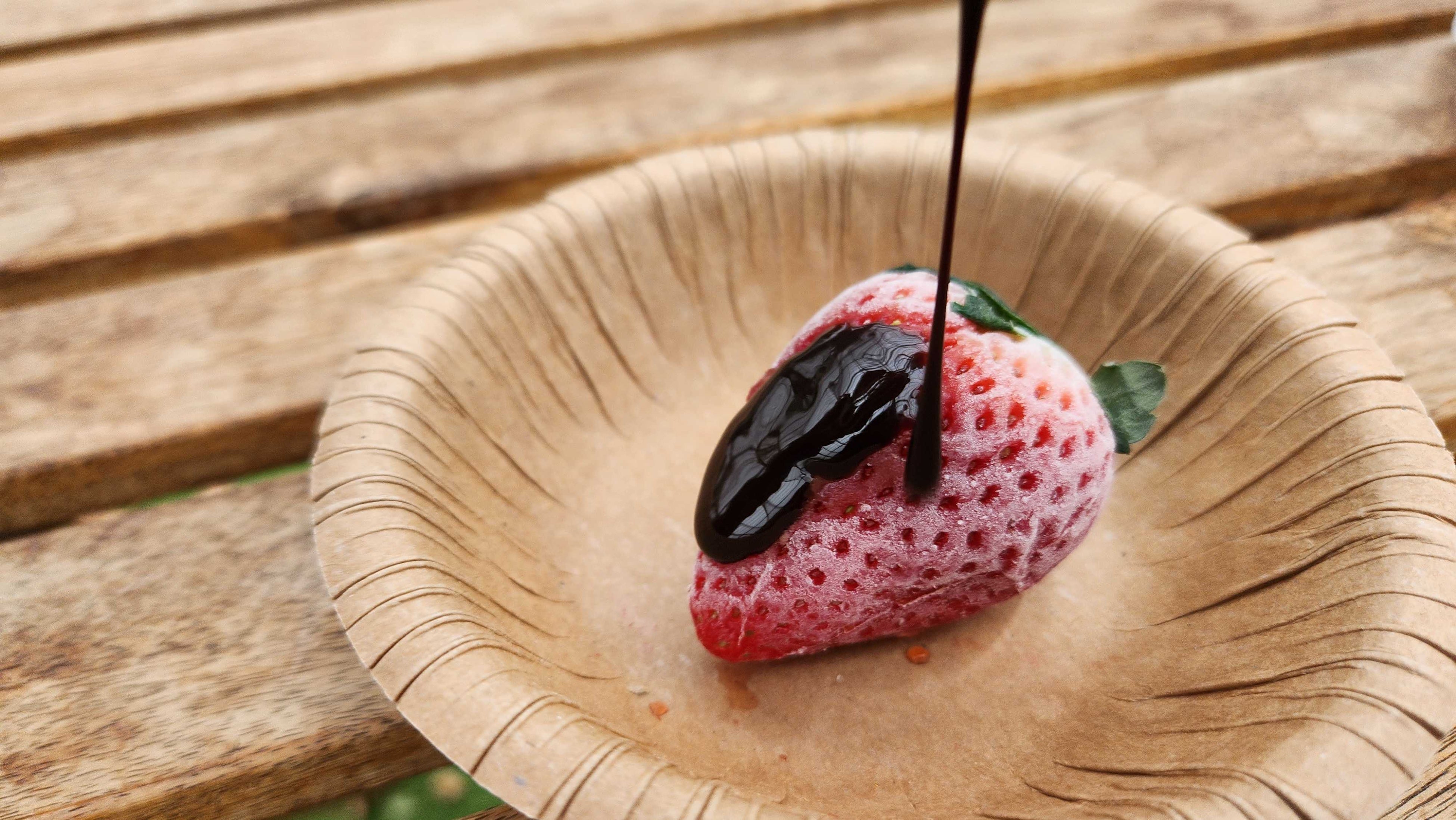 収穫したいちごが「フローズンストロベリー」に。チョコレートソースで「ホットチョコレート」