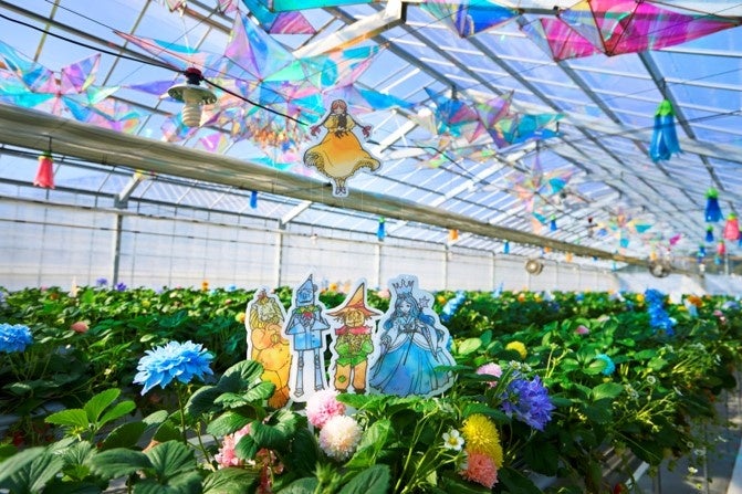 一般的ないちご温室は「苺の赤」と「葉の緑」の2色を基調とした風景が広がる所が多い中、「オズの魔法使い」の世界観をテーマにした本いちご狩り空間は、凝り性な発明家、「オズの魔法使い」のこだわりが随所にちりばめられています。頭上には「光を反射するアートのシャンデリアオブジェ」、いちごの周りには「カラフルなアートフラワー」が広がります。普段は入ることができないバラ園のバックヤードにある、オズの魔法使いが秘密にしていた「シークレットガーデン」感あふれるいちご園でいちご狩りが楽しめます。