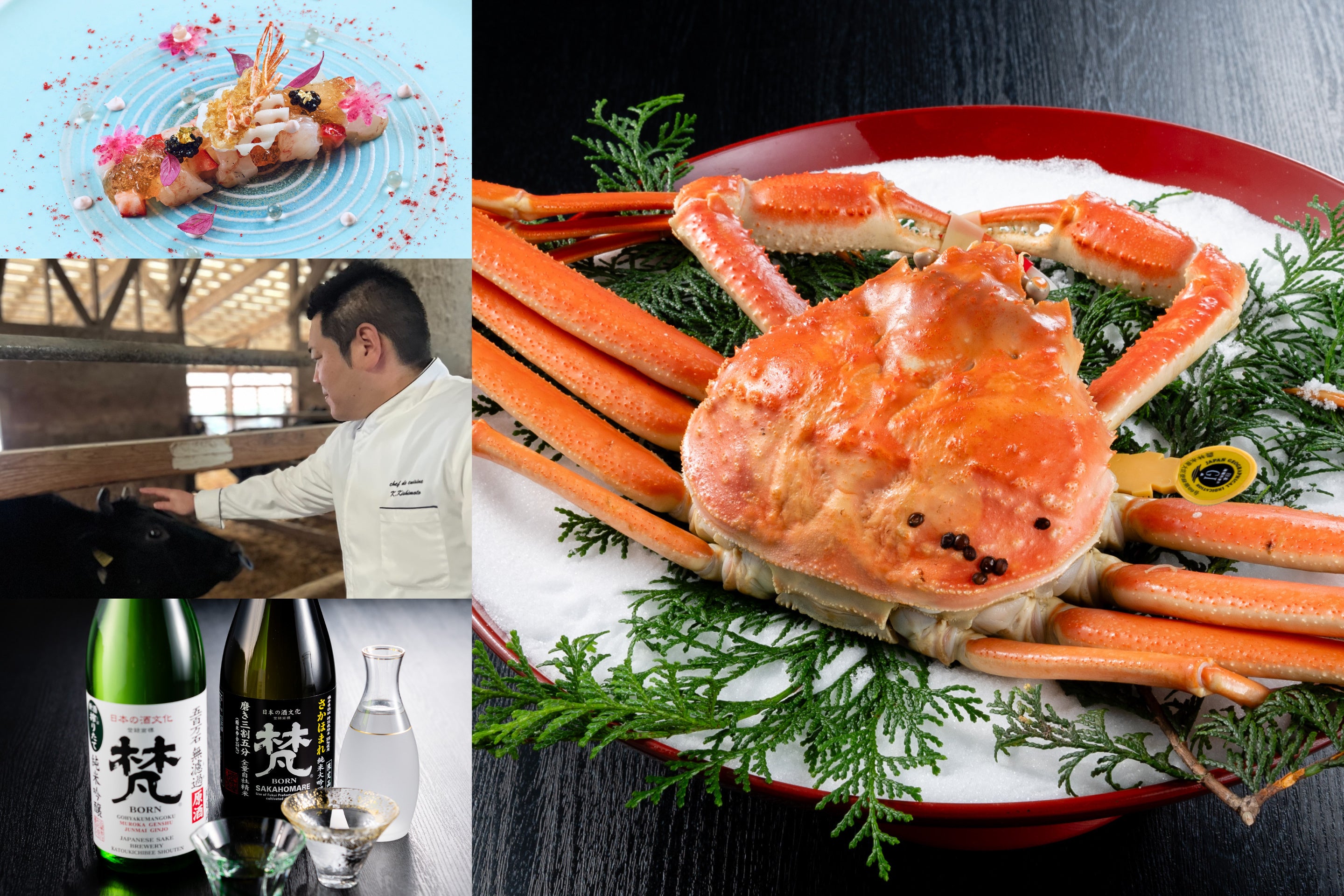 越前がにをメインに、福井県産の珍味を含む前菜七種盛りや、福井県の新しいブランド米「いちほまれ」を最後のお食事にご用意し、コースの始まりから終わりまで福井県の食材をお楽しみいただけます。