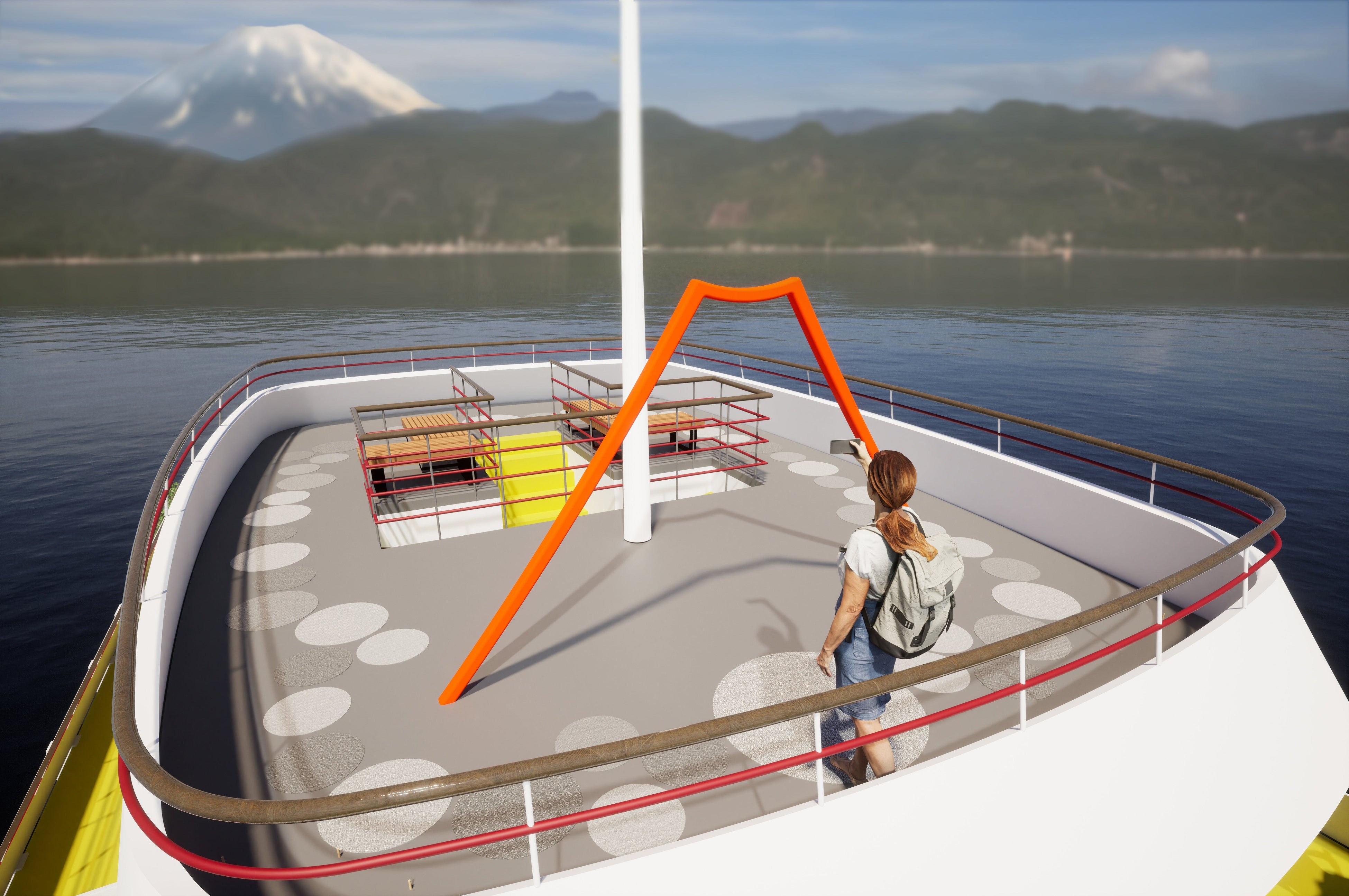 3階の屋外デッキには、“ブランコふう”ベンチや富士山型のベンチ、天然芝を敷き詰めた広場が登場します。陽の光を浴び、大自然の中で風を感じながら船旅を楽しめる、まさに“湖に浮かぶ緑の公園”を象徴する空間です。最上階の4階には、記念撮影にぴったりな富士山モチーフのモニュメントもあります。