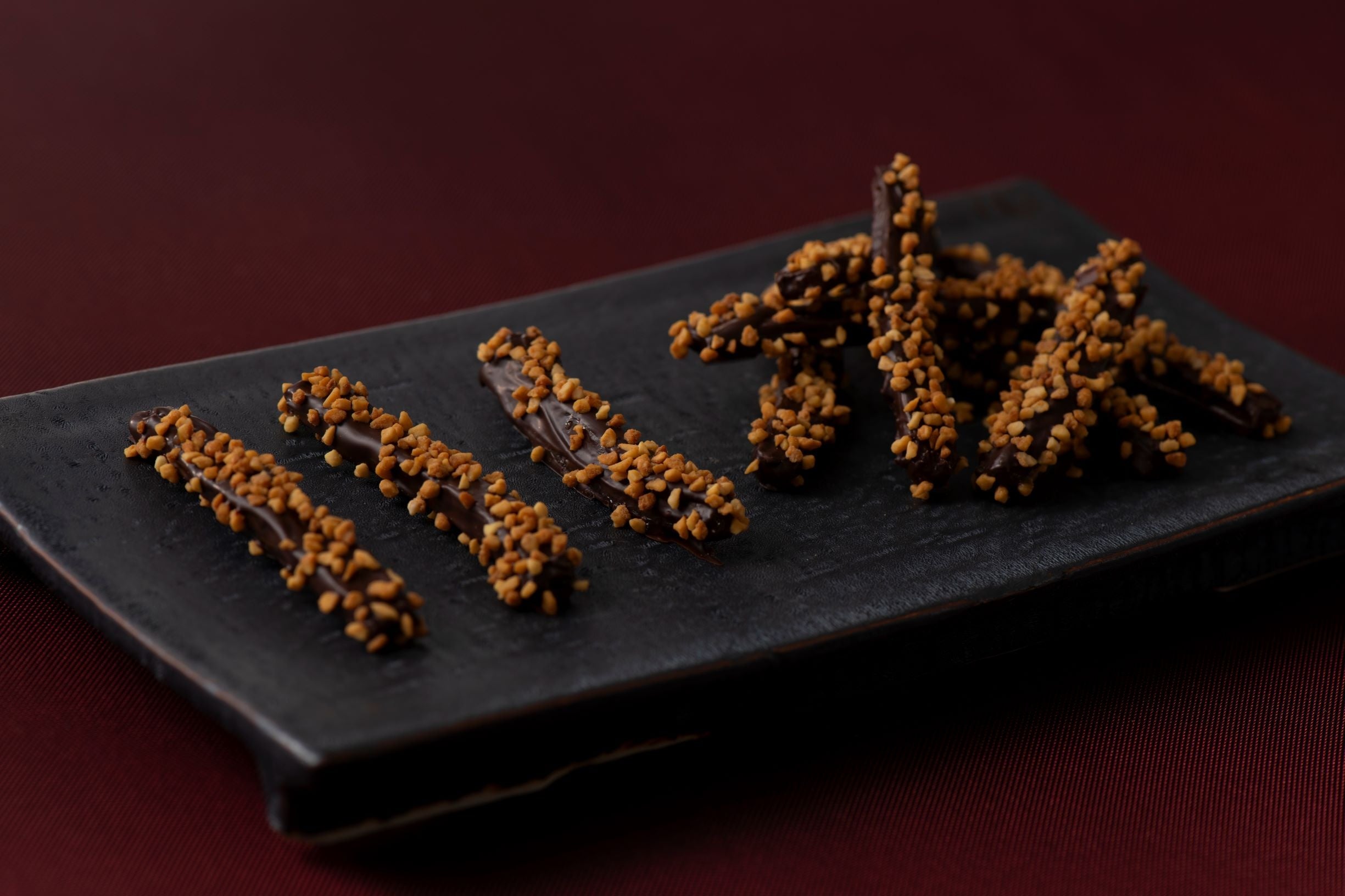 ブラックベリーティーの茶葉からエキスを抽出し、香り高いガナッシュとパートドフリュイ(ゼリー菓子)に仕上げて組み合わせました。フレッシュな果実感と甘いショコラのマリアージュが印象的です。