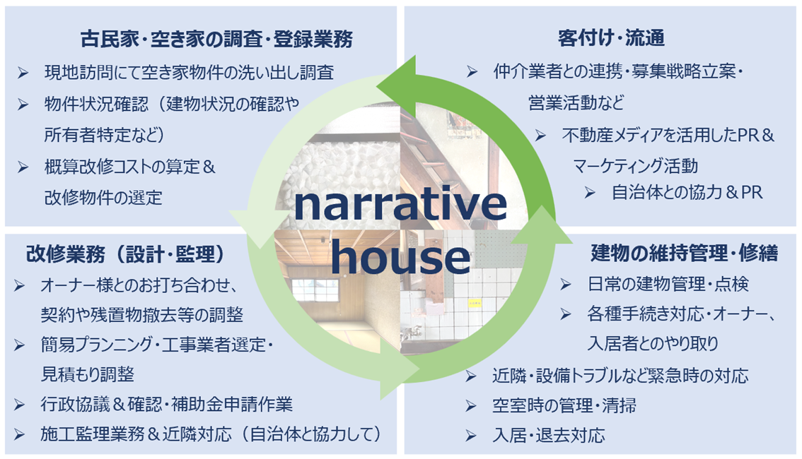 空き家等の古⺠家を、その建物が持つ歴史や⽂化、営みといった物語(narrative)をできる限り残す形で改修し、住居としての市場価値を与えて流通させる取り組みです。新築住宅と⽐べると、決して快適な空間ではないかもしれませんが、⼿間のかかる不⾃由さを享受し、⼯夫を凝らして過ごす⽣活、建物に寄り添いながら暮らす⽇常を提案します。