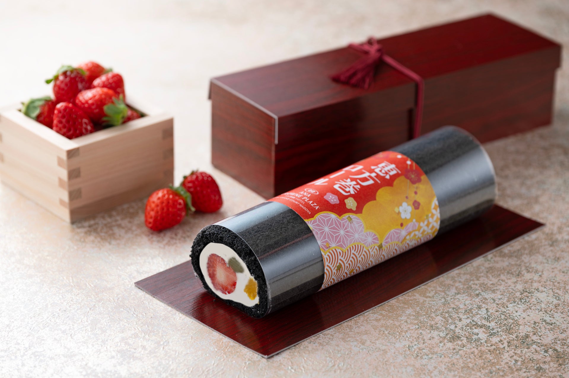 竹炭の生地で生クリーム・苺・キウイ・オレンジを巻き込んだ恵方巻に見立てた縁起の良いロールケーキです。