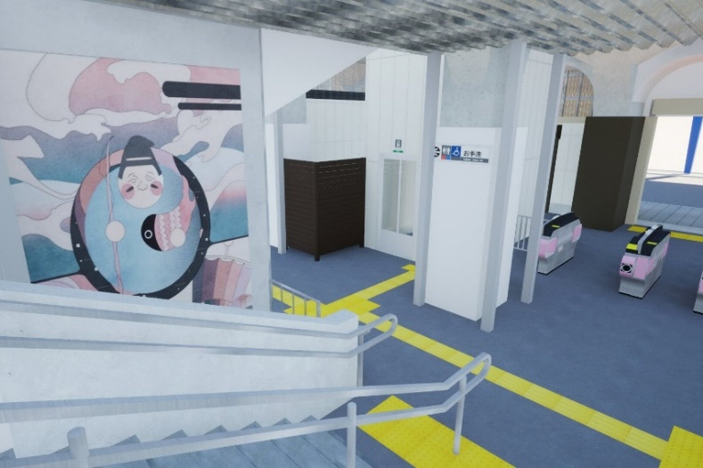 本リニューアルでは、「バリアフリー化による利便性向上」(①エレベーター新設 ②改札機増設 ③多機能トイレ新設)、「美装化による快適性の向上」(①階段横のデザインウォール設置 ②男女トイレリニューアル ③駅の美装化)に取り組み、お客さまの利便性・快適性の向上を図りました。 改札内の階段横壁面には、デザインを得意とする当社社員が制作した「えべっさん」を描いており、今宮戎駅をご利用のお客さまを温かくお出迎えします!今宮戎駅をご利用の際は、ぜひこちらにもご注目ください。