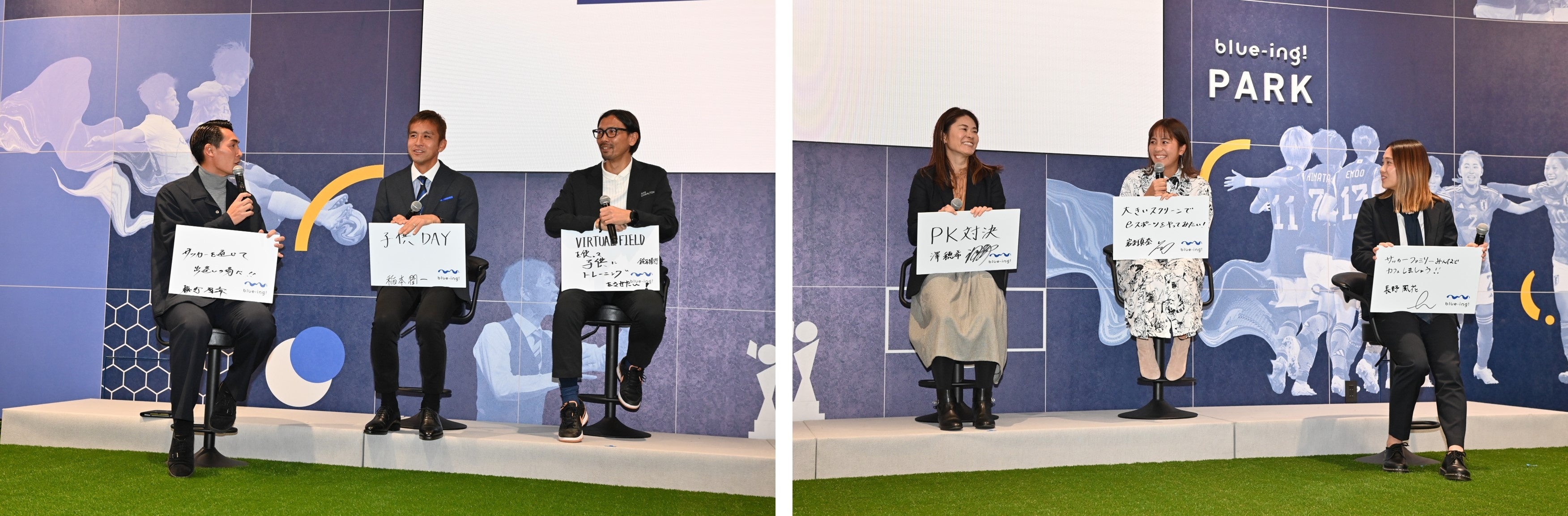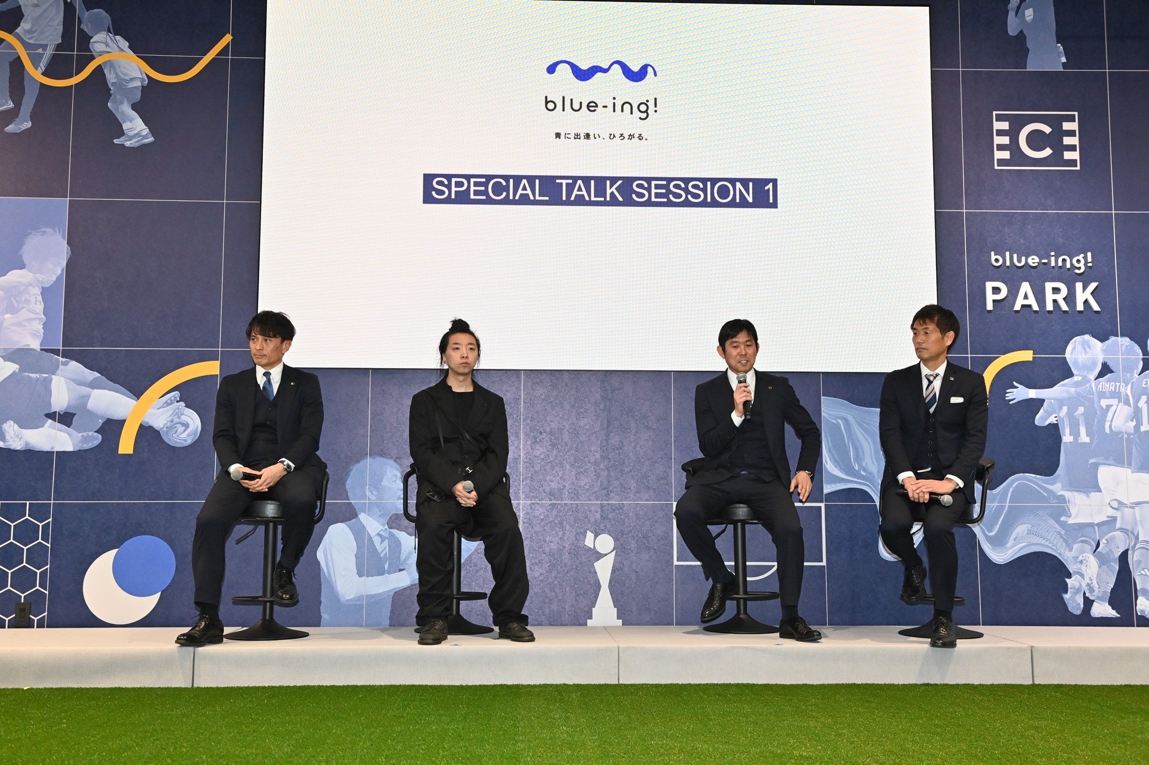 後半では豪華ゲスト陣によるトークセッションを2部構成で開催。第1部では、先程登壇した宮本理事、落合氏に加え、SAMURAI BLUE 森保一監督、なでしこジャパン 池田太監督が登壇。落合氏から”スポーツ×デジタルの融合”に関しての話に対して、森保監督は「サッカーを知っている方も知らない方も両方楽しんでもらう場はなかなか作れない」と驚きの表情で頷いていました。また池田監督からもblue-ing!の今後について、「自分がやっている監督とはまた別の形で、サッカーの素晴らしさを発信する基地として期待したいです」と大きな期待を寄せるコメントがありました。
