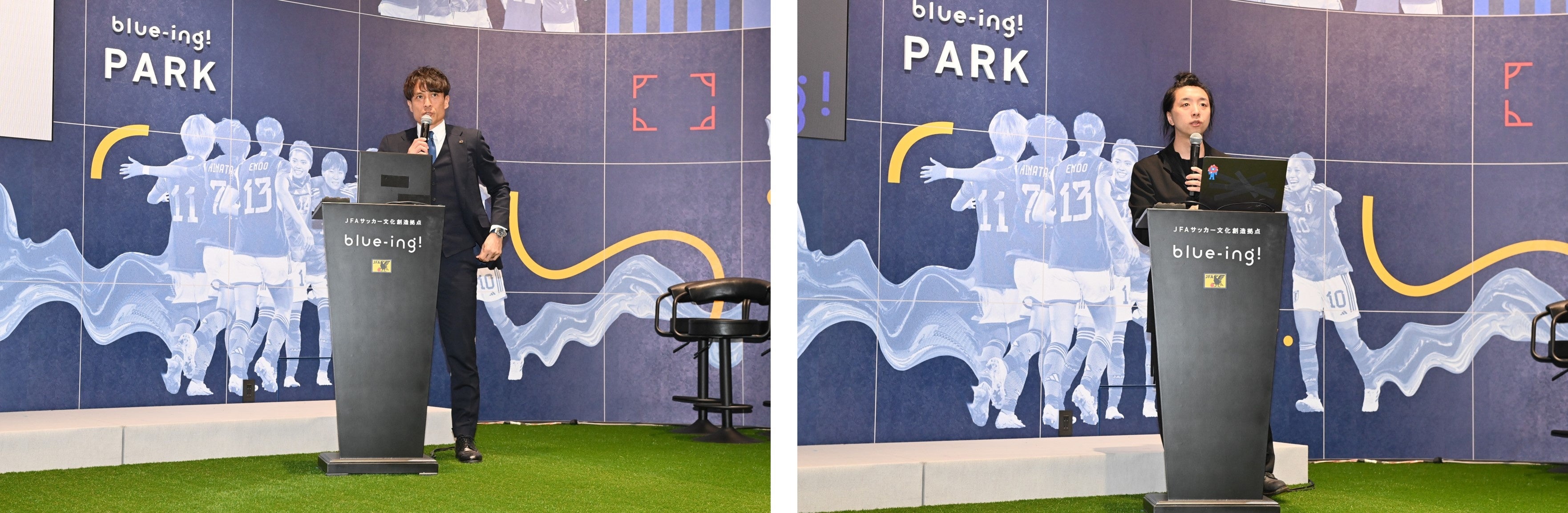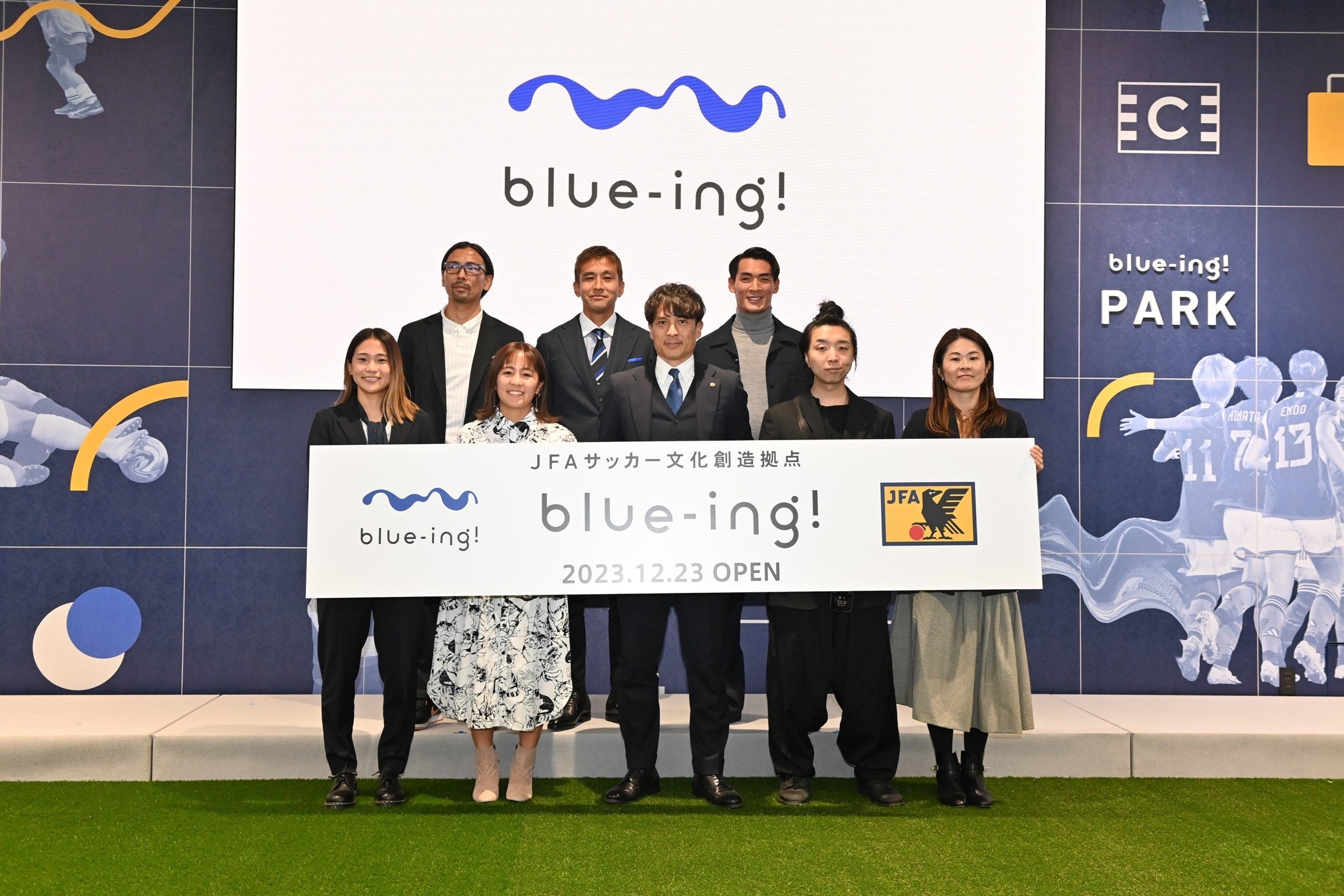 blue-ing!は、JFAと三井不動産株式会社が2021年に締結した「サッカーの力を活用した街づくり連携および拠点再編に関する基本協定」における共同プロジェクトの一つとして進めてきたもので、筑波大学デジタルネイチャー開発研究センター長の落合陽一氏監修の下、「“未来”につなぐ、コミュニケーションと創造の場」をコンセプトにした次世代型の体験型コンテンツや最新のデジタル展示、AI自動生成などが楽しめるエリアのほか、イベントスペースやカフェ&バー、サッカーショップなども併設。