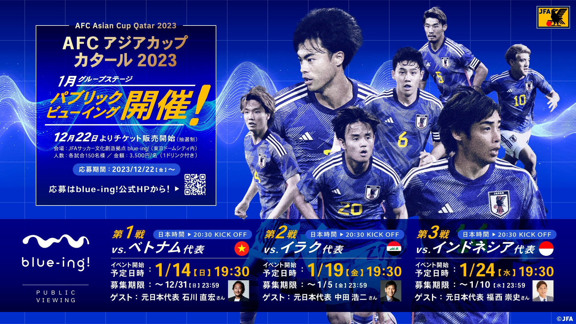 blue-ing!初のパブリックビューイング開催として、「AFC アジアカップカタール2023」グループステージを戦うSAMURAI BLUEの3試合のパブリックビューイングを開催することが決定しました。今回のイベントを行うPARKエリアは、大型ビジョンを兼ね備えた公園感のある人工芝生が特徴です。さらに、各日ともゲストに石川直宏さん、中田浩二さん、福西崇史さんら日本代表OBを迎えて、豪華なゲストの皆様と、海外の地で戦うSAMURAI BLUEを応援します。