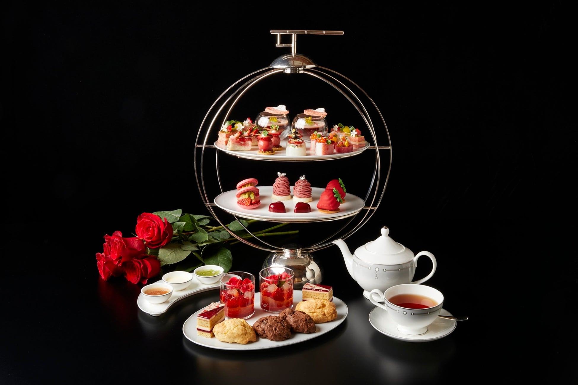 「ロマンティックタイム アット ザ・ロビーラウンジ」には、豆腐とクリームチーズのムースをストロベリーとフランボワーズのジュレでコーティングした一品や、ダブルコンソメのジュレの中に根菜を入れ、その上にストロベリー風味の根セロリのピュレを重ねた一品など、計5品のセイボリーとフィンガーサンドウィッチ2種類をご用意する他、スウィーツには、「いちごのモンブラン」や「ミックスベリーと赤桃のオパリスガナッシュ」など、バレンタイン気分を盛り上げる全6品をご用意いたします。
