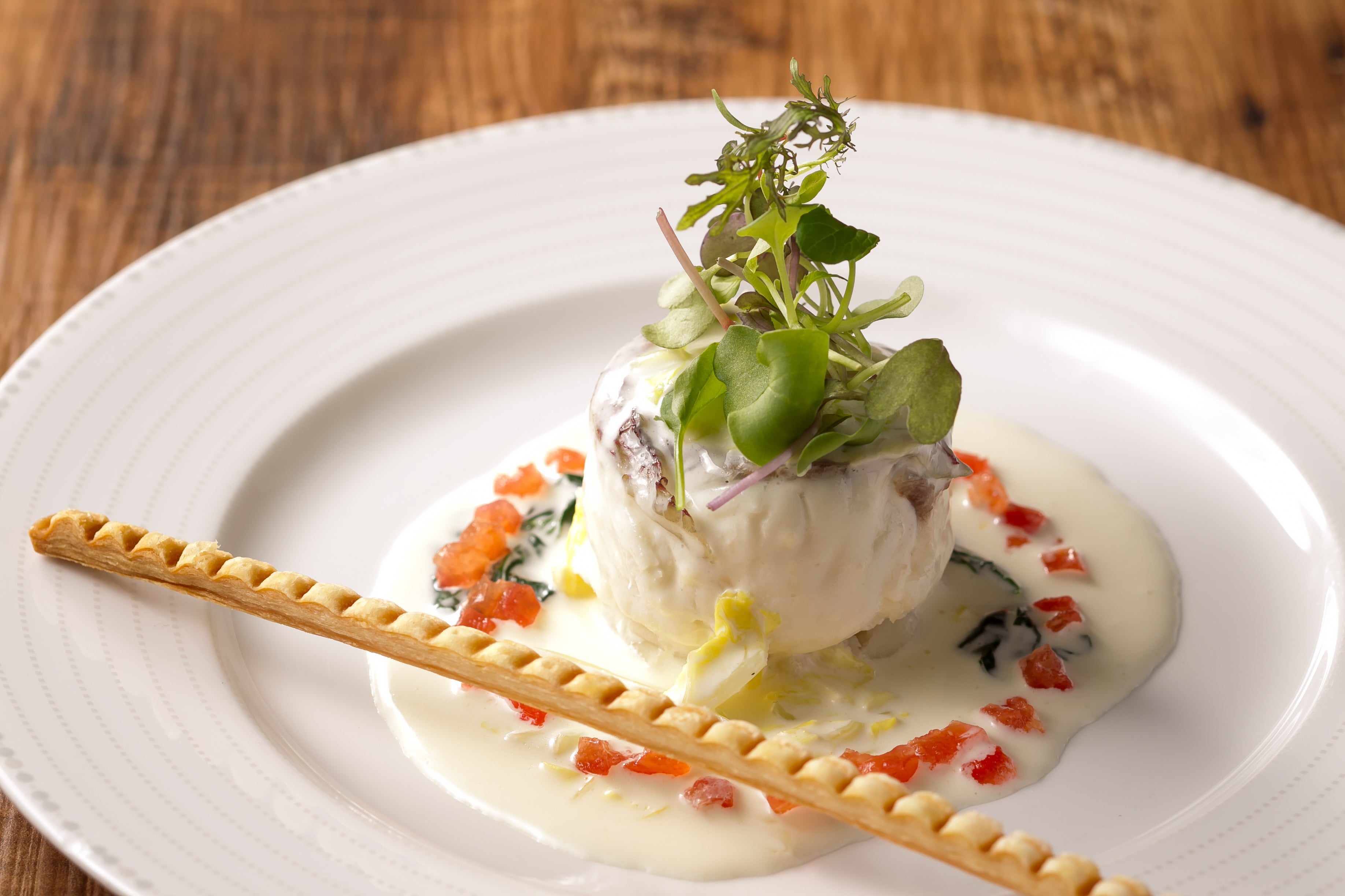 瀬戸内産真鯛を白身魚のムース詰め 白ワインソースで