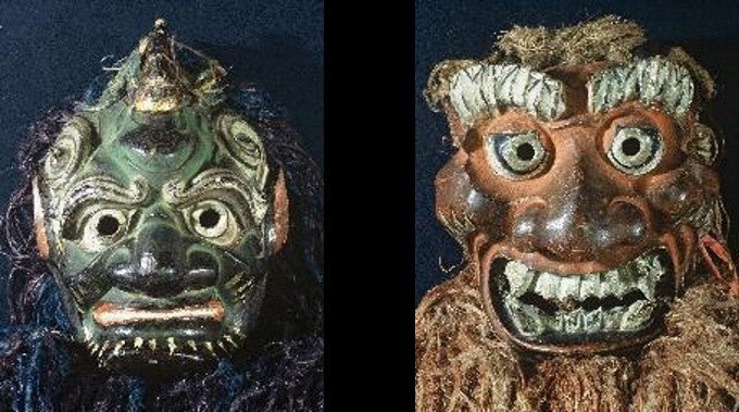 赤鬼面と青鬼面の個性的な表情に注目です。
