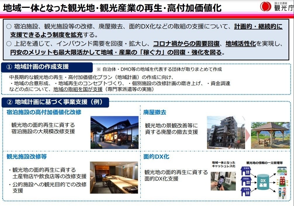 観光産業において、近年は変化がさらに大きく、コロナ禍における失われた2年間や旅行者の価値変化、アフターコロナにおけるインバウンドの急拡大など、大きな転換期を迎えています。その中で、コロナ禍からの出口戦略として、国と地域が一体となって世界基準で地域の魅力を面的に整備していく動きを推進しており、ある種の地域間競争が推し進められています。