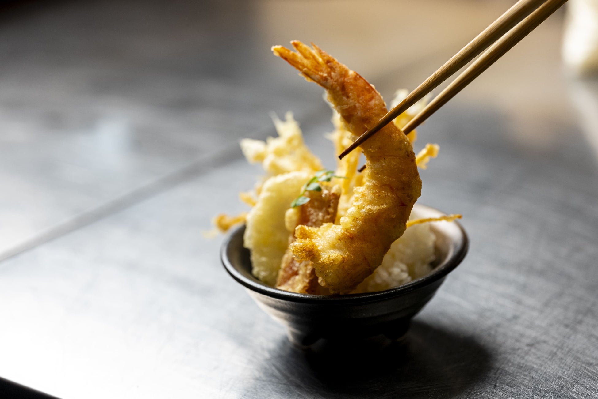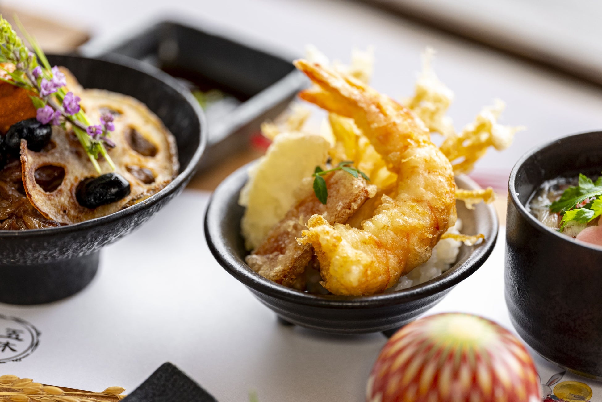 厳選素材を組み合わせ、調理方法も細部までこだわっております。「海老と季節の天丼」はプリプリで新鮮な海老を、丁寧に下処理しサクサクの衣をまとわせた、味と触感どちらにもこだわりを詰め込んでおります。海老の天ぷらと盛り合わせるのは冬の旬野菜です。
