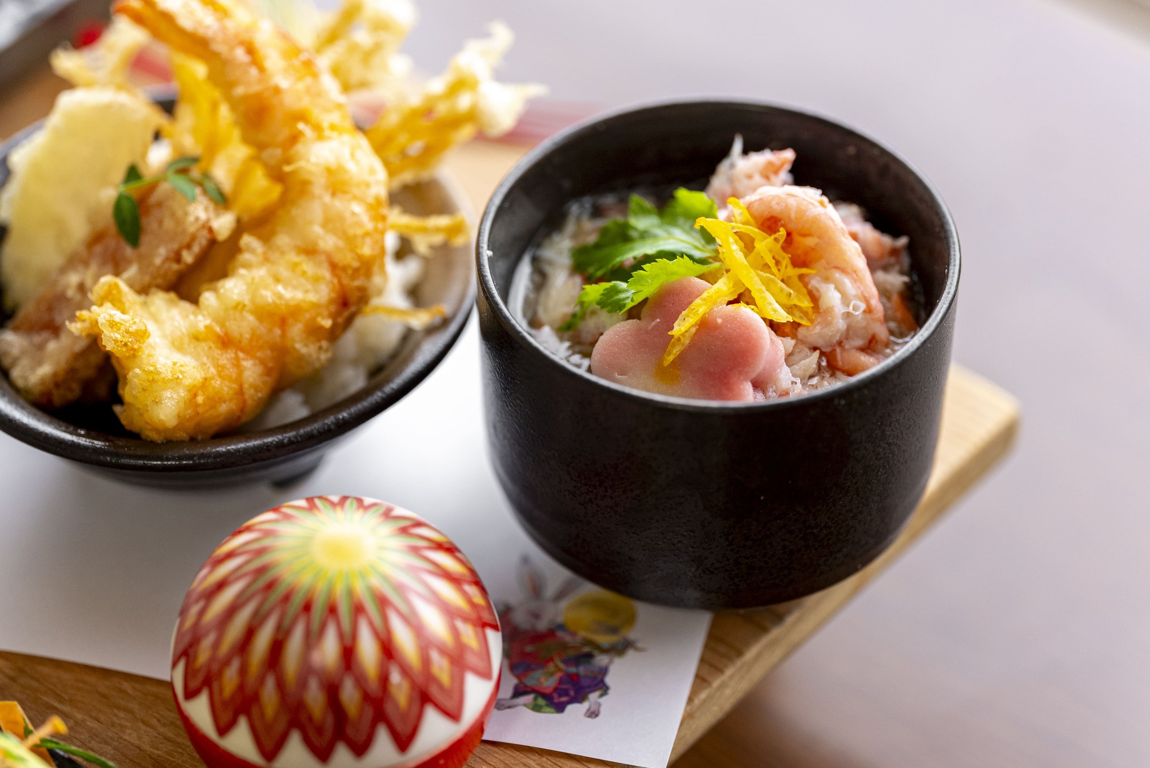 厳選素材を組み合わせ、調理方法も細部までこだわっております。「海老と季節の天丼」はプリプリで新鮮な海老を、丁寧に下処理しサクサクの衣をまとわせた、味と触感どちらにもこだわりを詰め込んでおります。海老の天ぷらと盛り合わせるのは冬の旬野菜です。
