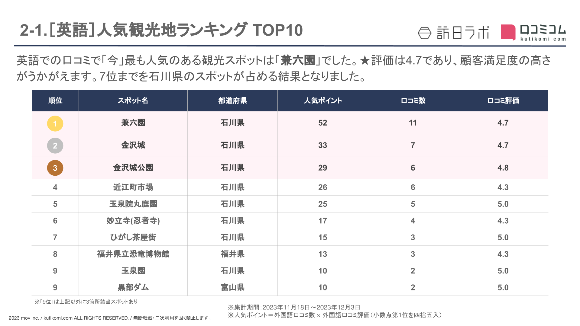 英語での口コミで「今」最も人気のある観光スポットは「兼六園」でした。★評価の高さから、顧客満足度の高さがうかがえます。