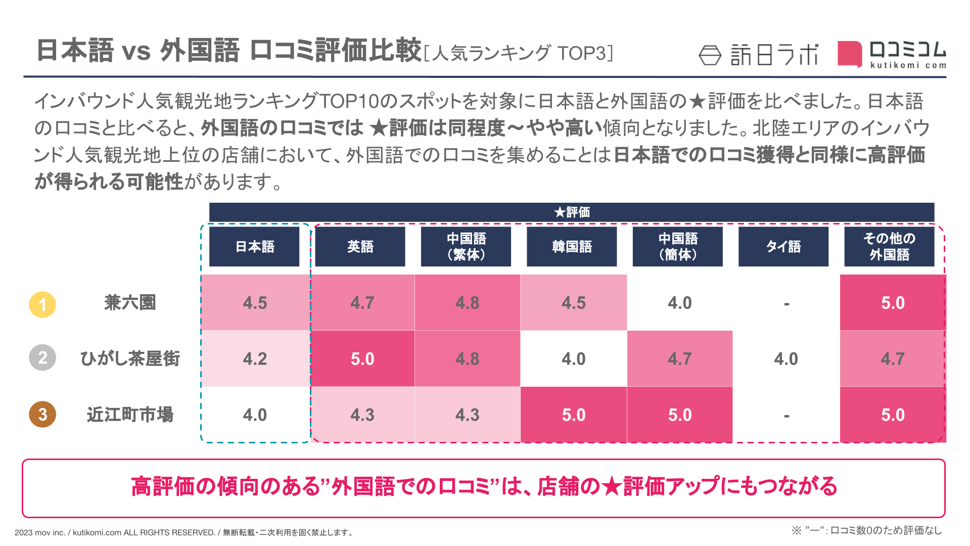 日本語の口コミと比べると、外国語の口コミでは ★評価は同程度〜やや高い傾向となりました。北陸エリアのインバウンド人気観光地上位の店舗において、外国語での口コミを集めることは日本語での口コミ獲得と同様に高評価が得られる可能性があります。