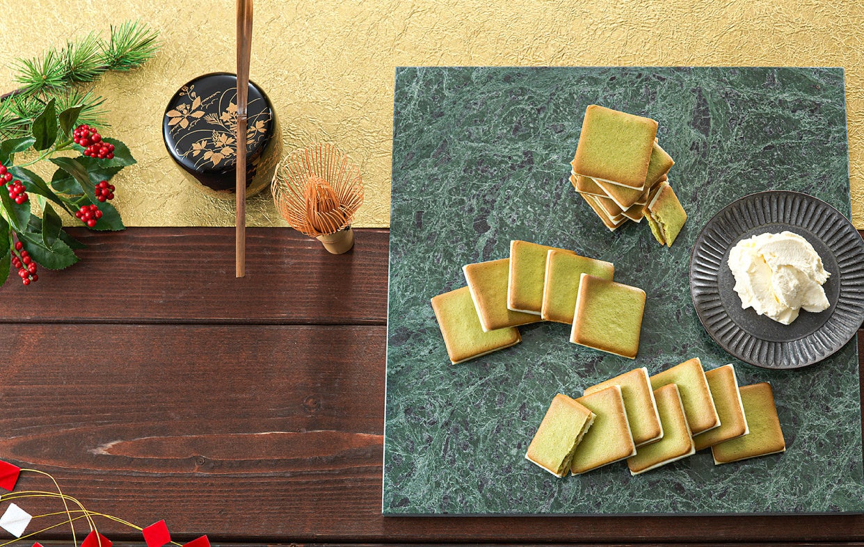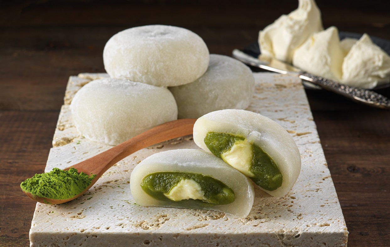 京都の琴引浜の塩を使用したお餅に宇治抹茶餡とマスカルポーネチーズとチェダーチーズ入クリームを包み込みました。もちっとした食感と抹茶のほろ苦さ、そしてクリーミィなチーズの絶妙なあんばいは、まさに和洋折衷。