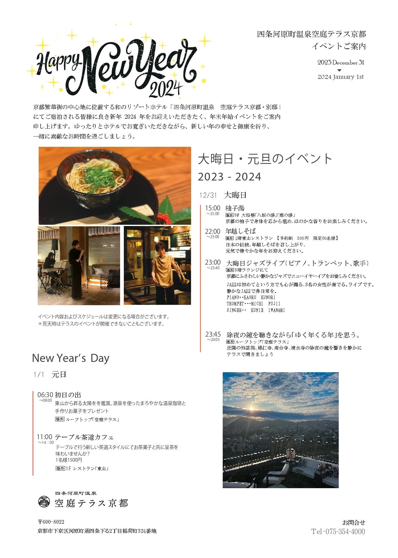 京都繁華街の中心地に位置する和のリゾートホテル「四条河原町温泉 空庭テラス京都・別邸」 にてご宿泊される皆様に良き新年 2024 年をお迎えいただきたく、年末年始イベントをご案内。ゆったりとホテルでお寛ぎいただきながら、新しい年の幸せと健康を祈り、 一緒に素敵なお時間を過ごしましょう。